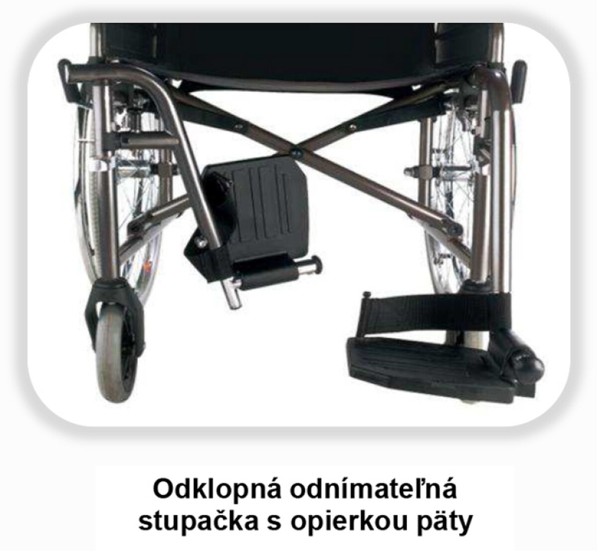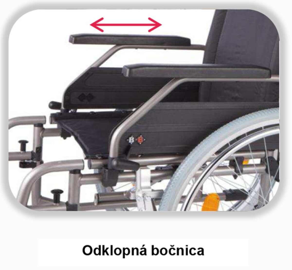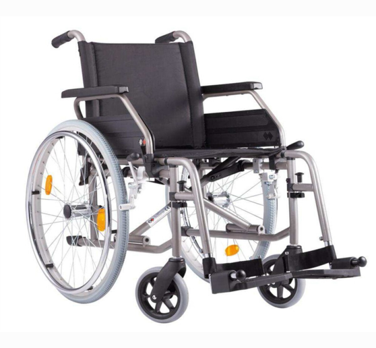 Összecsukható mechanikus acélvázas könnyű kerekesszék felnőttek számára. A karfák hátrahajthatók de nem levehetők az ülés és a háttámla műanyag, állítható lábtartókkal, és szilárd tömör kerekekkel készül.