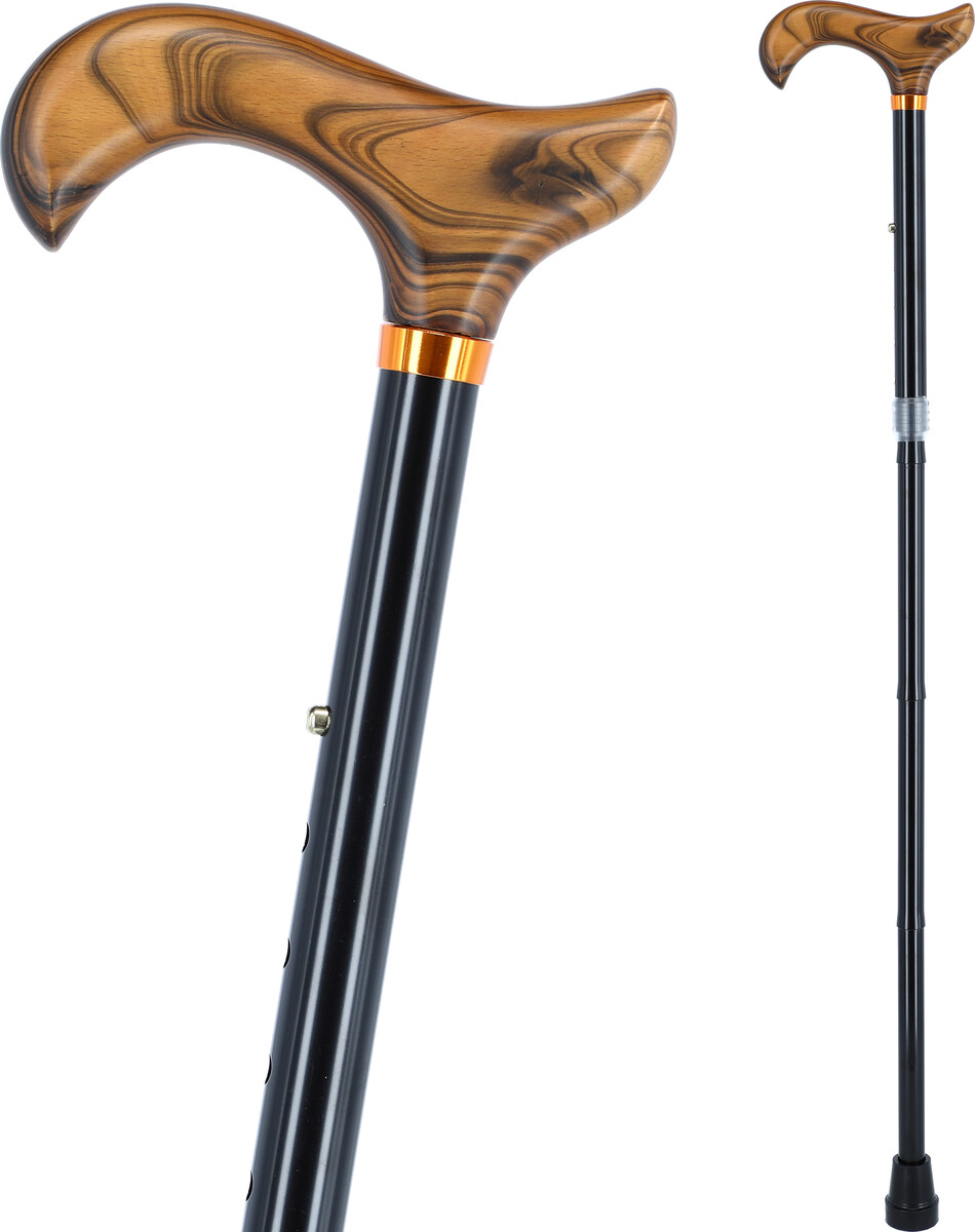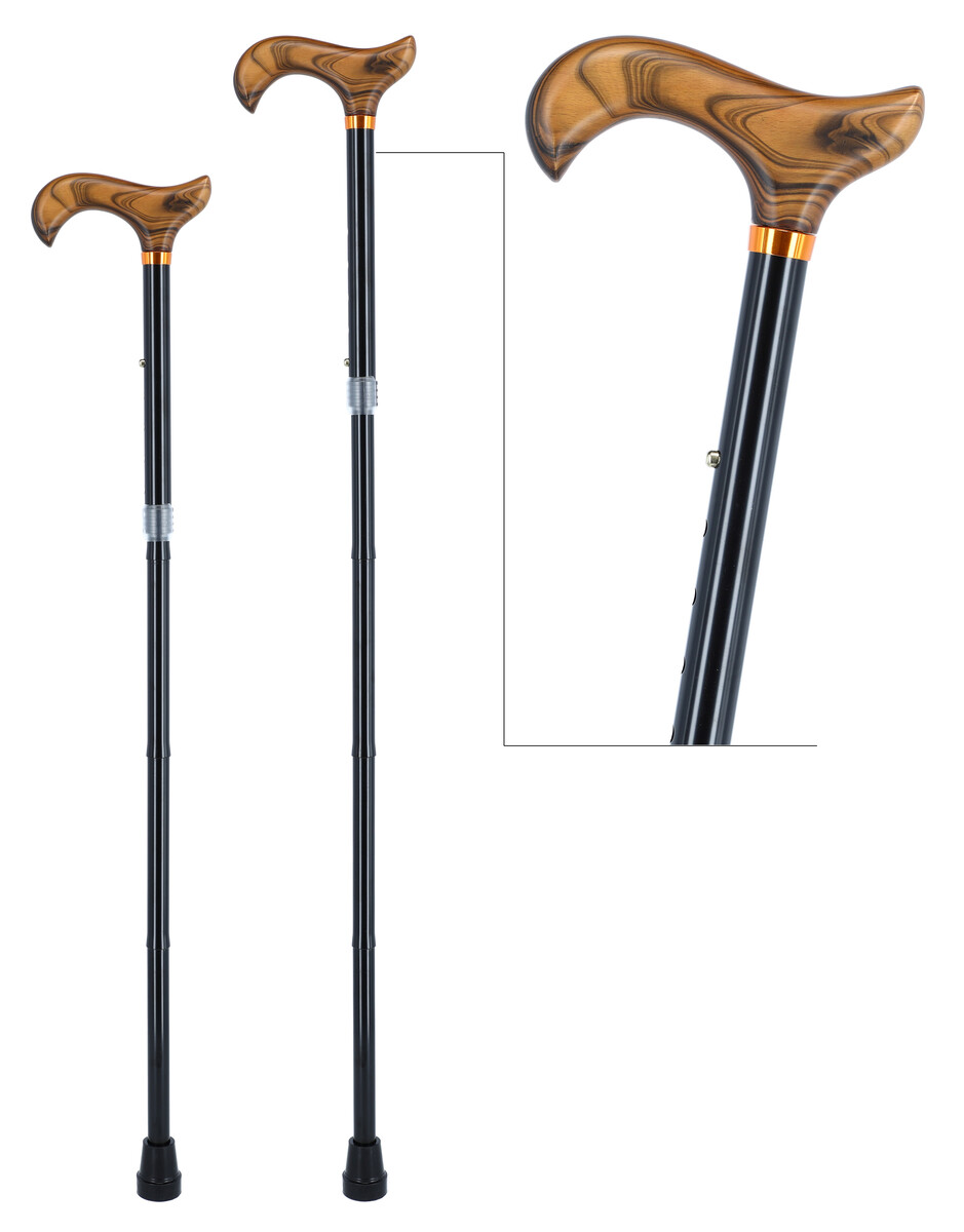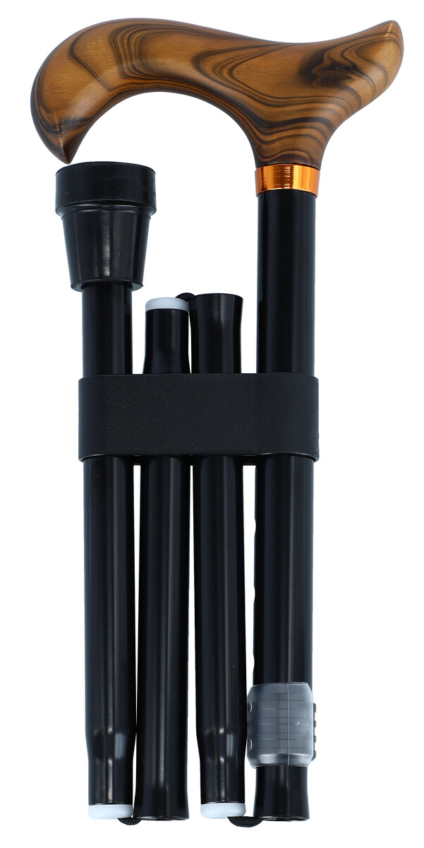 A fekete összecsukható járóbot, mely barna fogantyúval van ellátva, egy modern sétabot, a járás segítségére. A járóbot gumitalppal van ellátva a biztonságos és csendes használat érdekében.