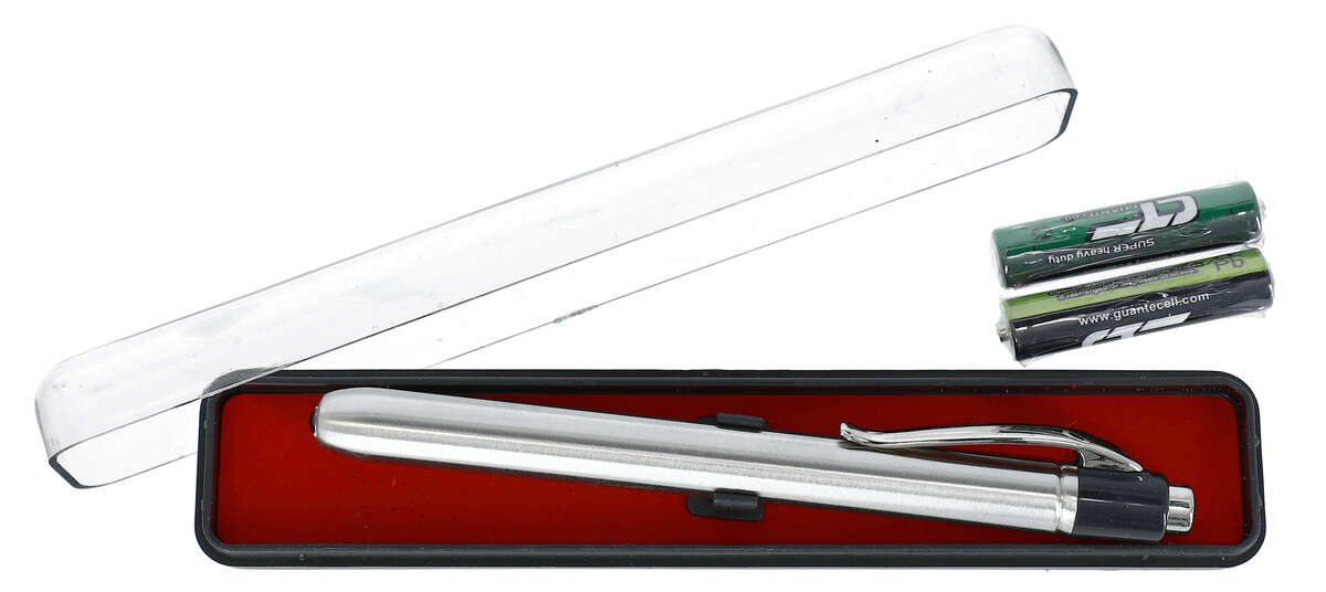 A könnyű orvosi diagnosztikai toll exkluzív könnyűfémből - alumíniumból - készült. A fénytoll rögzítőkapcsokkal van ellátva. A diagnosztikai tollhoz két AAA elem tartozik.