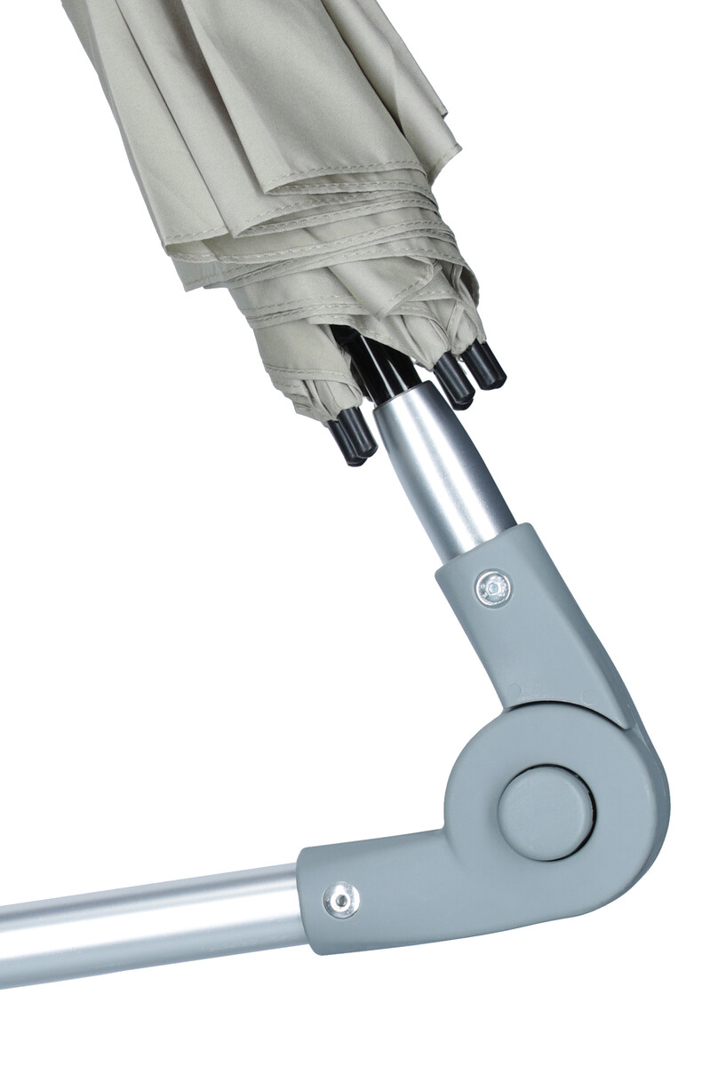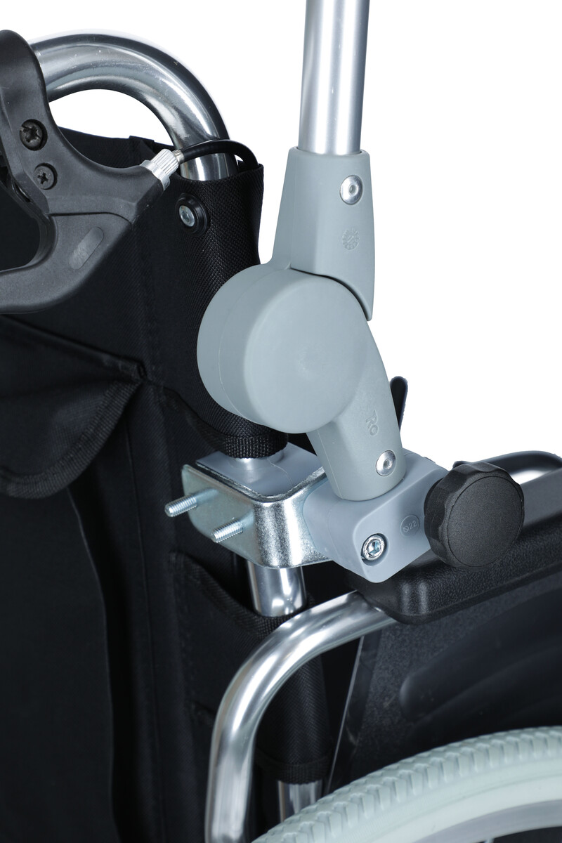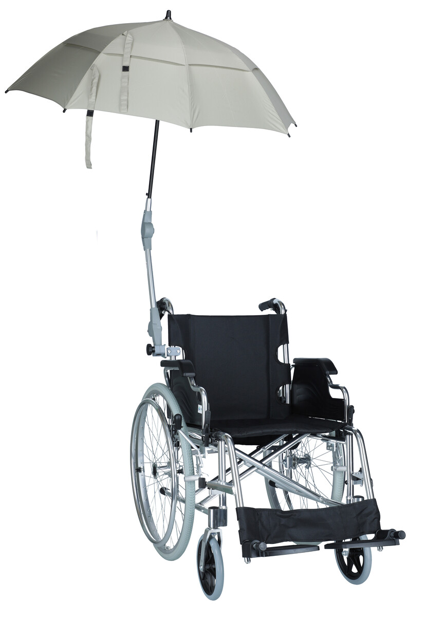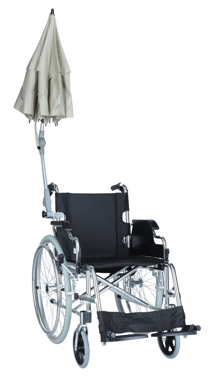 Állványos állítható ernyő, különböző típusú kerekesszékhez, rollátorhoz vagy járókerethez csatlakoztatható.