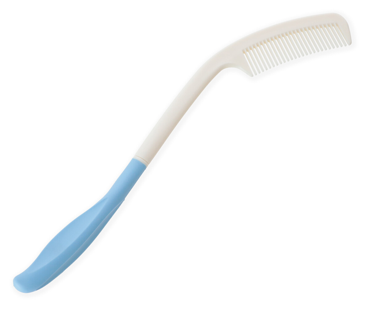 A speciális hajlított nyelű fésű segítséget nyújt azon páciensek részére, akiknek nehézkés, gátolt a csukló, könyék vagy váll mozgása.