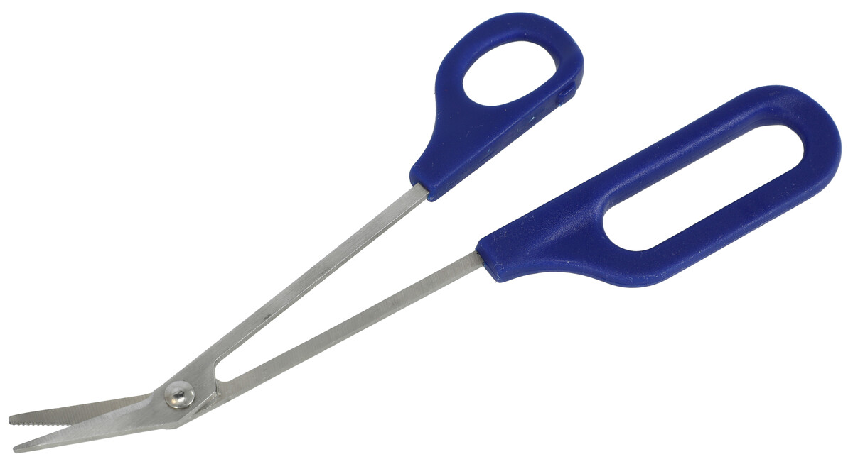 Meghosszabbított olló hajlított heggyel egyszerűbb használatra.