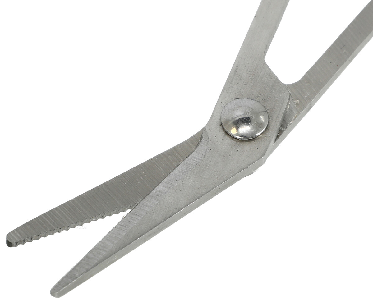 Az ívelt hegyű meghosszabított olló rozsdamentes acélból készült. Felső része bordázott, mely meggátolja a csúszást.