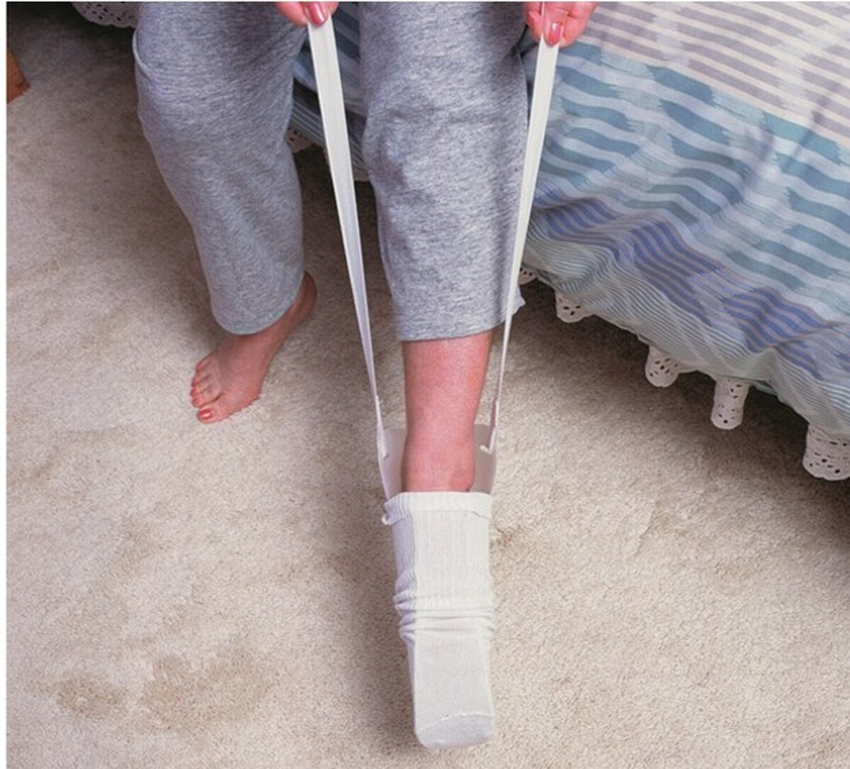 Ez a segédeszköz segíti a zokni felhúzását a lábra, és leginkább azoknak az egyéneknek van rá szügségük, akiknek a lehajlás nehézségeket okoz.