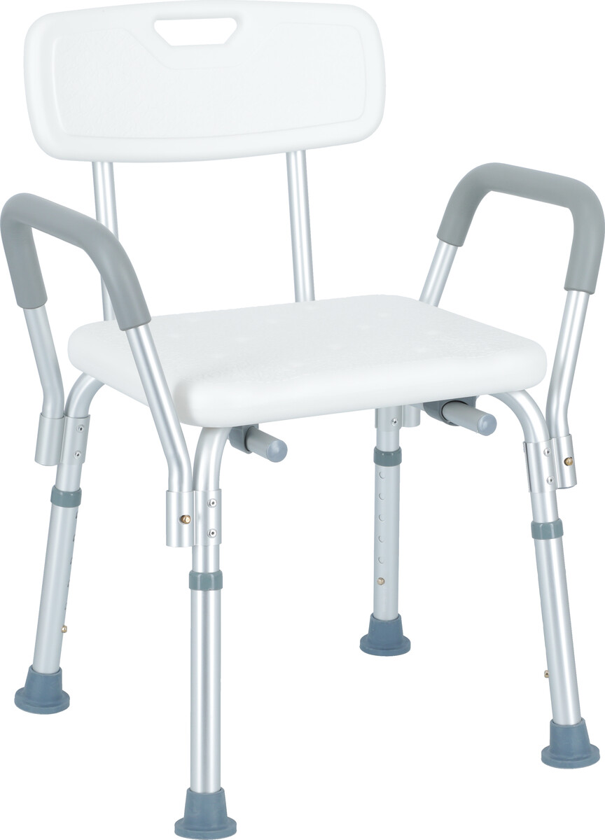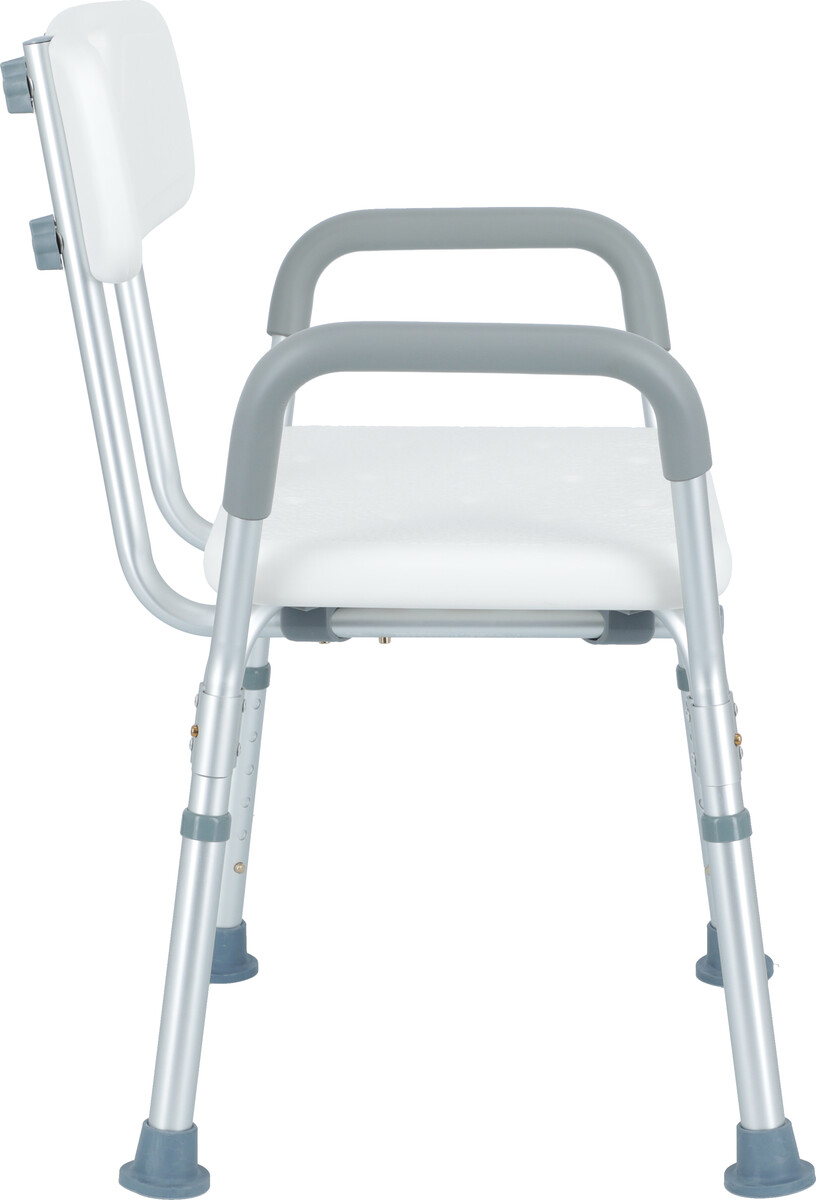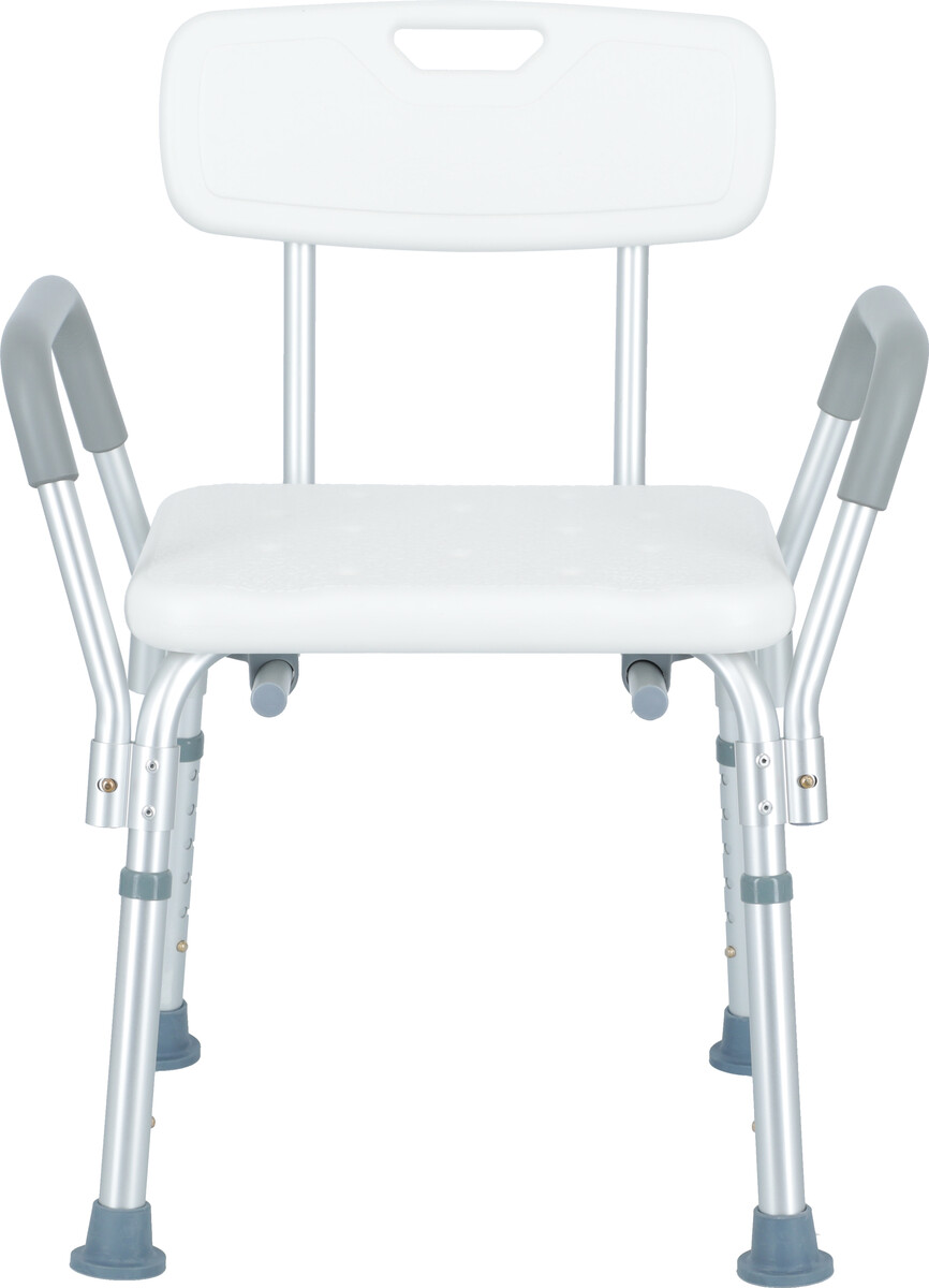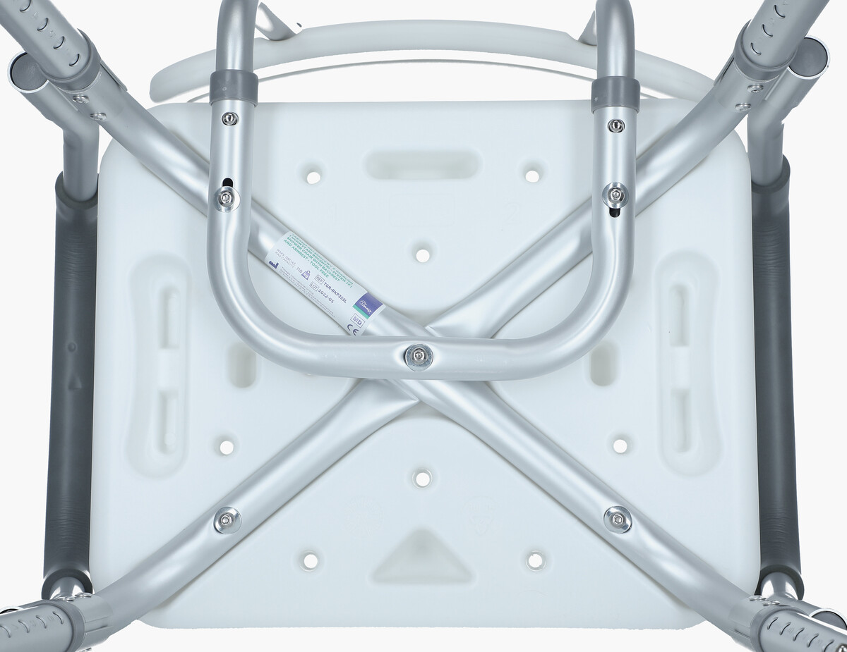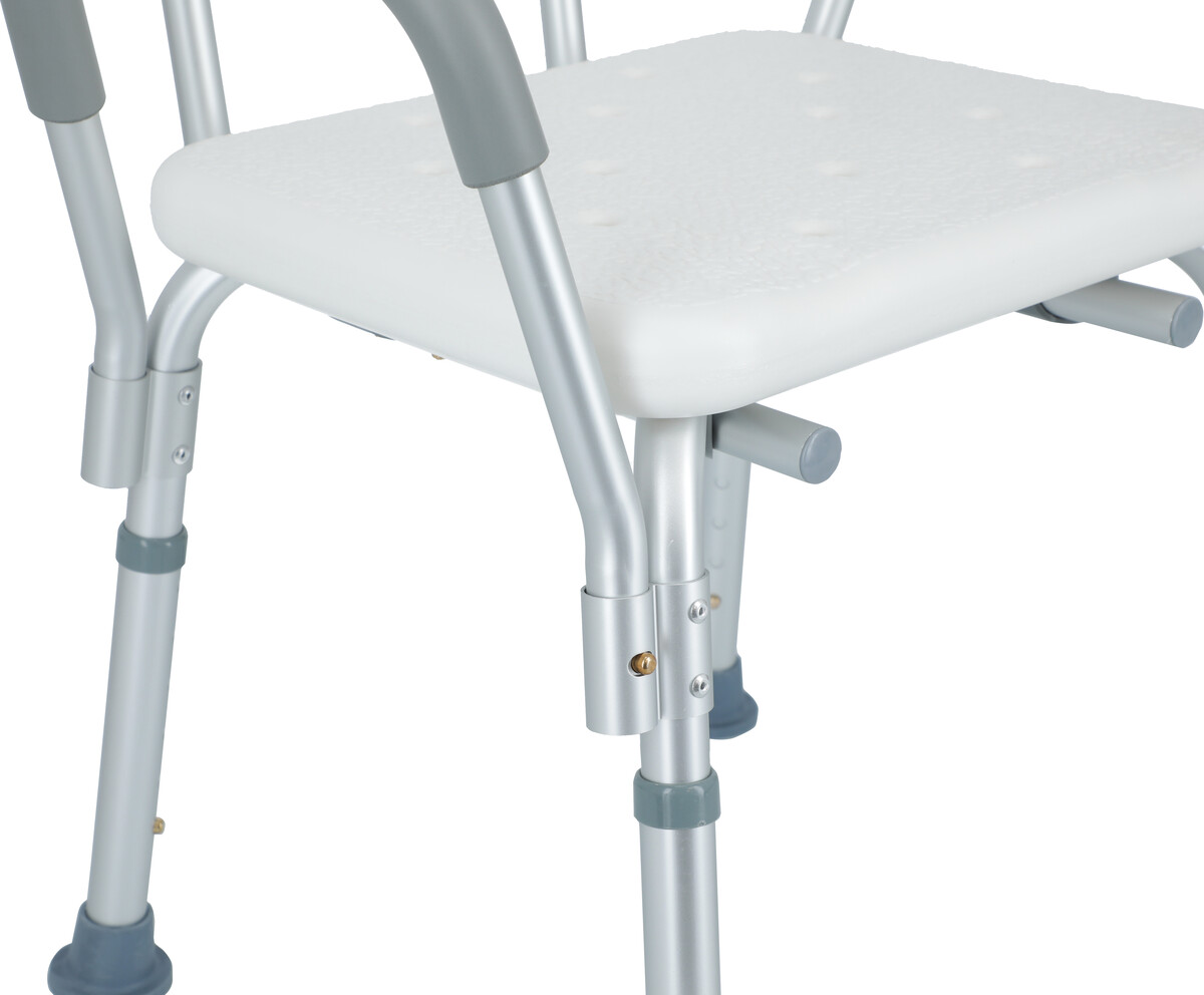 Állítható magasságú tusoló szék kartámasszal, mely segít a betegnek egyszerűen és biztonságosan a zuhanyzóba, fürdőkádba be és kilépni.