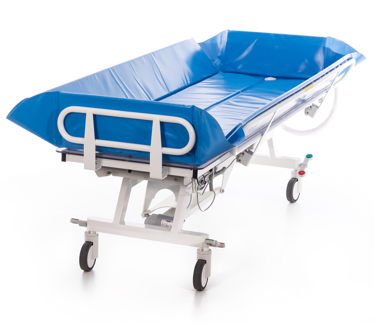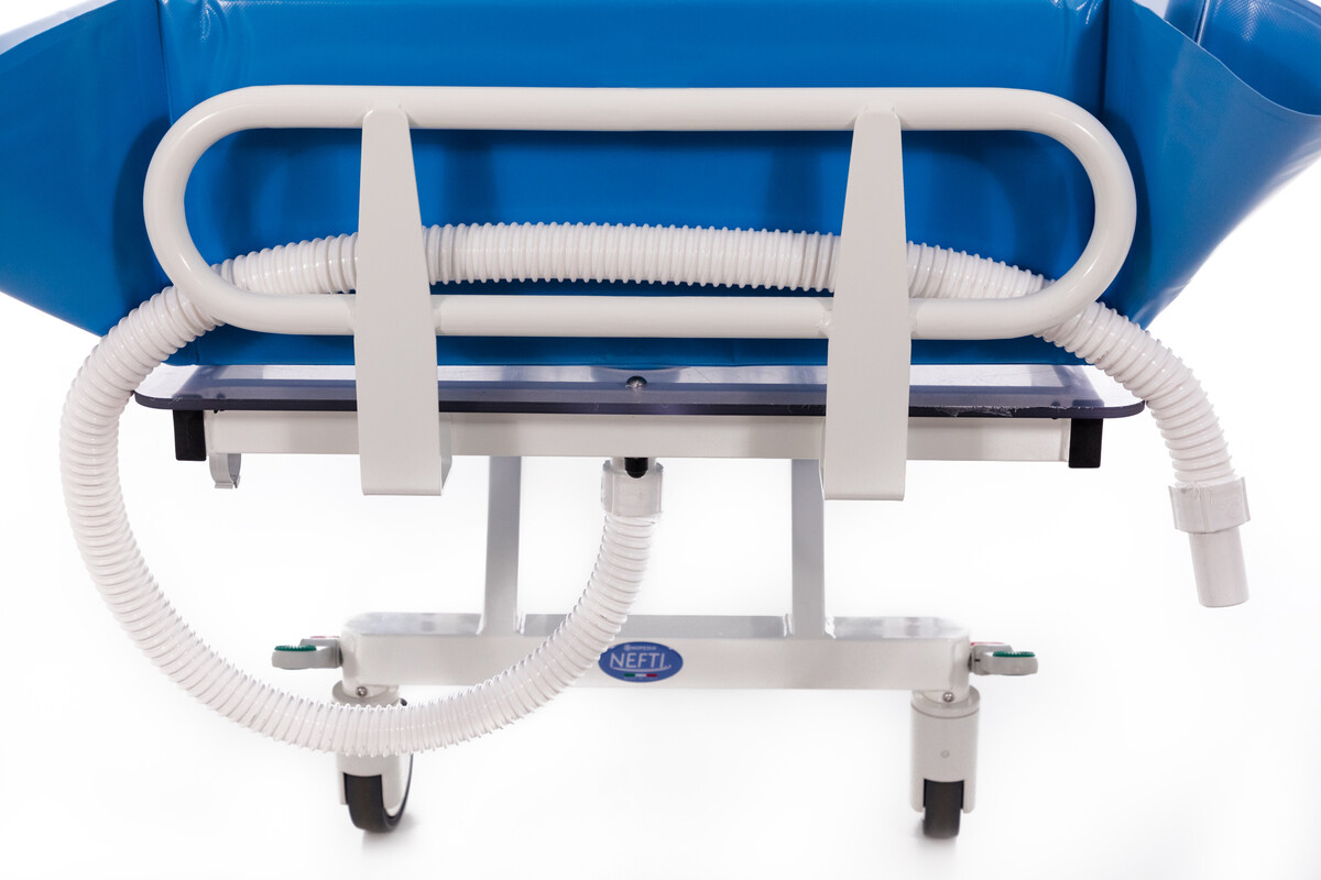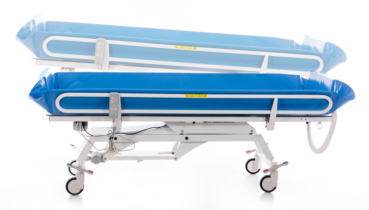 A fürdető ágy magassága állítható, és nagy segítséget nyújt azon betegek fürdetésénél, akik ágyhoz vannak kötve, hasznos akár az otthoni ápolás folyamán, valamint kórházakban és különféle ápolási infézményekben is. Az ágy Antitrendelenburg-pozícióba is állítható, amikor a feji-rész 5˚-kal a lábszint fölé van emelve. Használata nagyon könnyű és egyszerű.