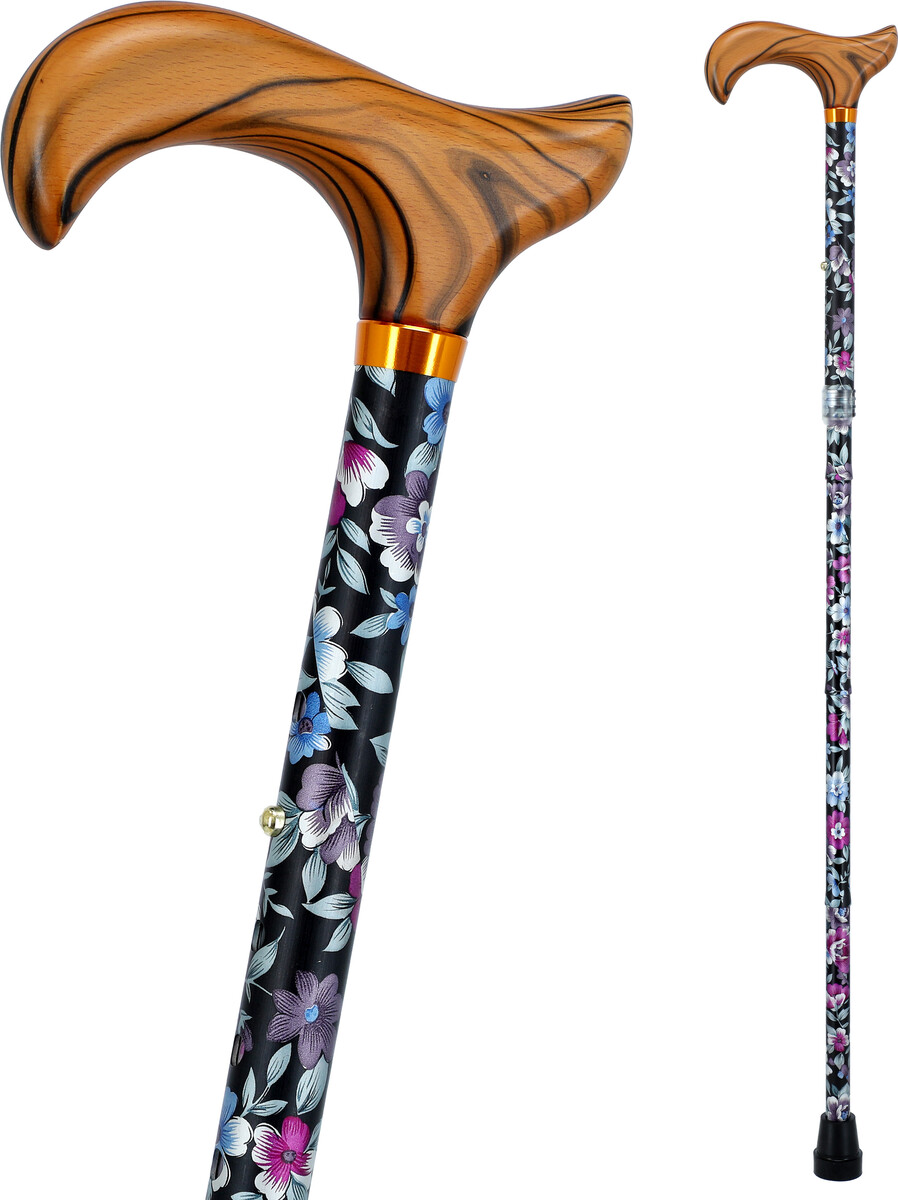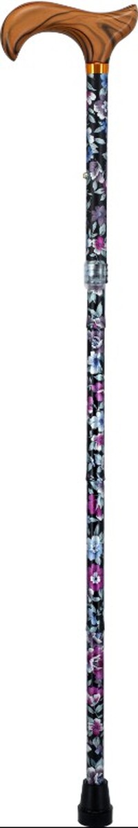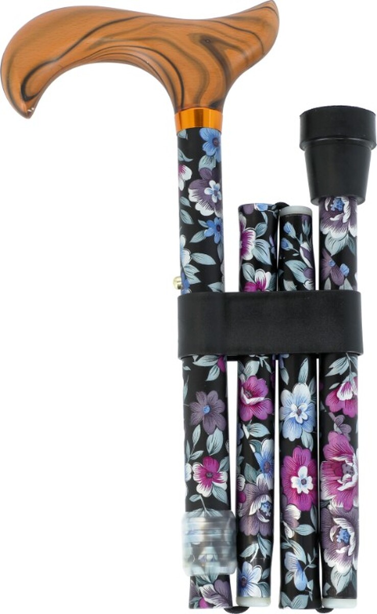 A virágos összecsukható sétabot, barna anatómiai fogantyúval, egy modern járóbot amely a járást kisegíti. A járóbot végén csúszásmentes járóbot gumi van, ami csendes és biztonságos használatot biztosít.