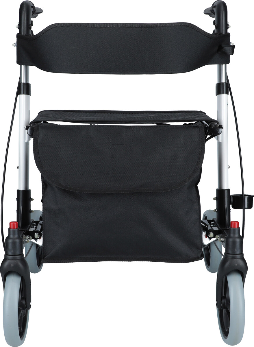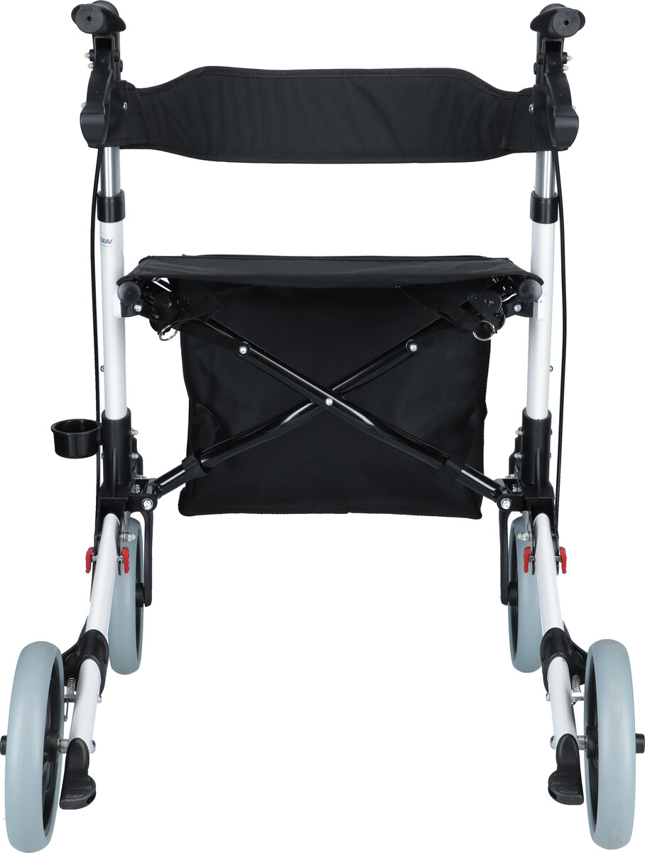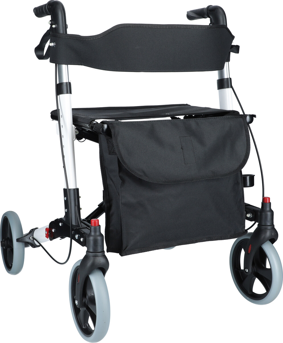 A rollátor könnyű, erős alumínium vázas és a felülete aloxált. A kerekek atmérője 20cm. Praktikus táskával kiviteles, amely a személyes dolgok hordozására, biztonságos tárolására szolgál.