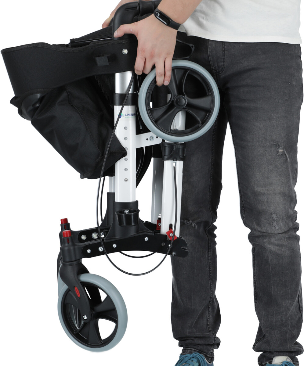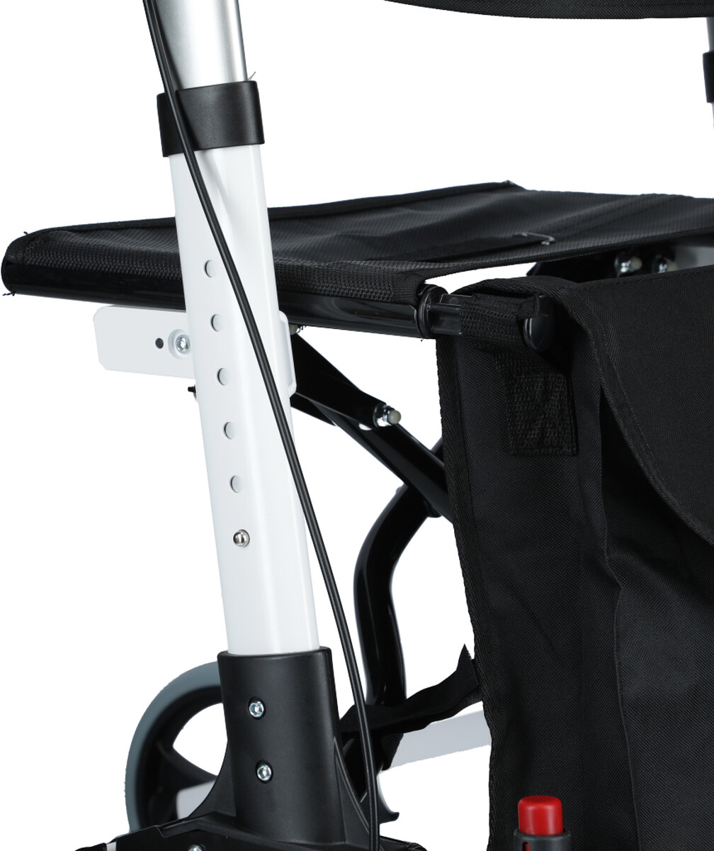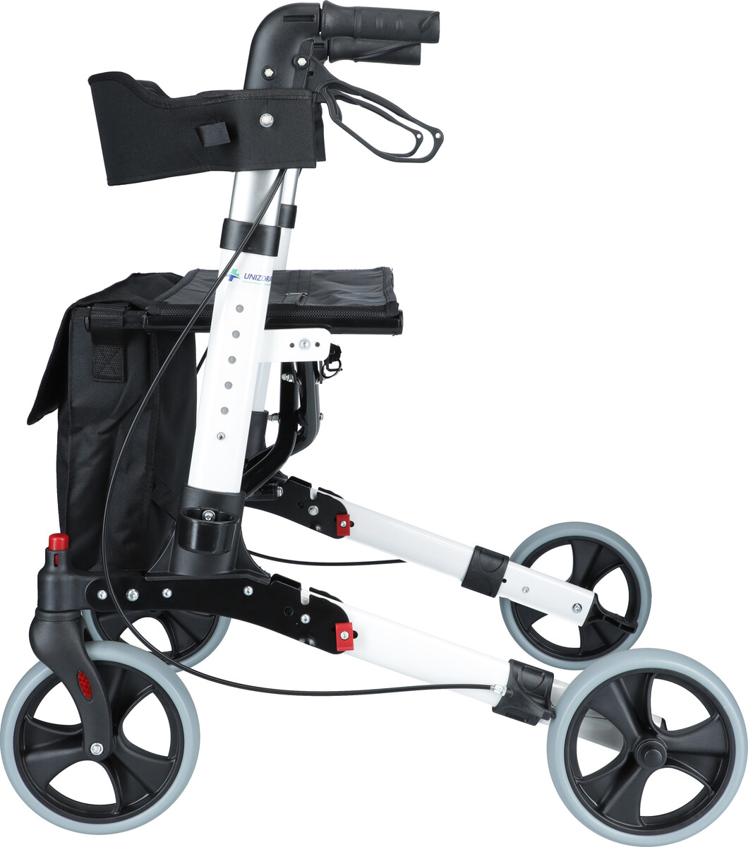 A rollátor könnyű, erős alumínium vázas és a felülete aloxált. A kerekek atmérője 20cm. Praktikus táskával kiviteles, amely a személyes dolgok hordozására, biztonságos tárolására szolgál.