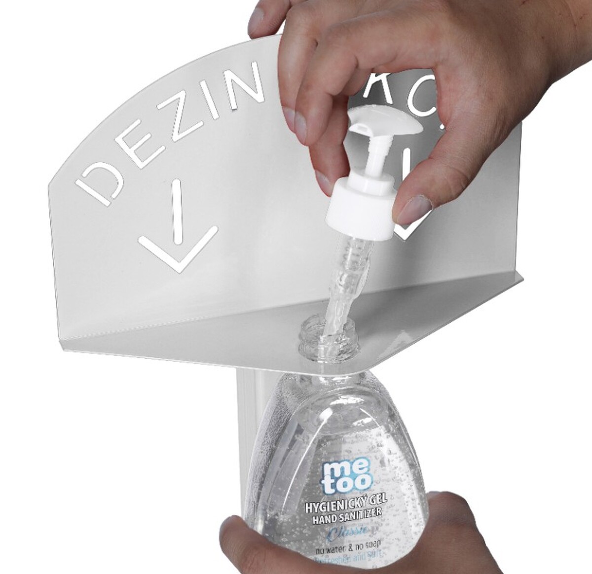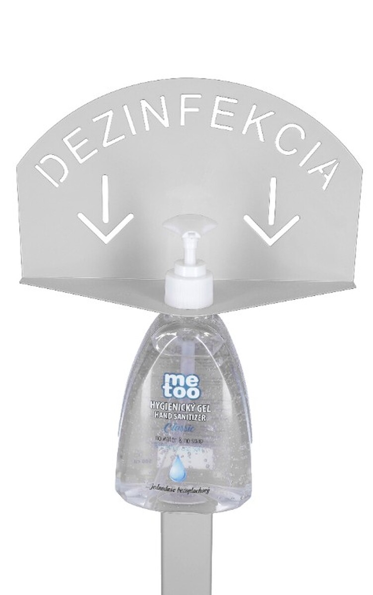 Univerzális fémállvány fertőtlenítőszerek rögzítéséhez fertőtlenítő géllel.