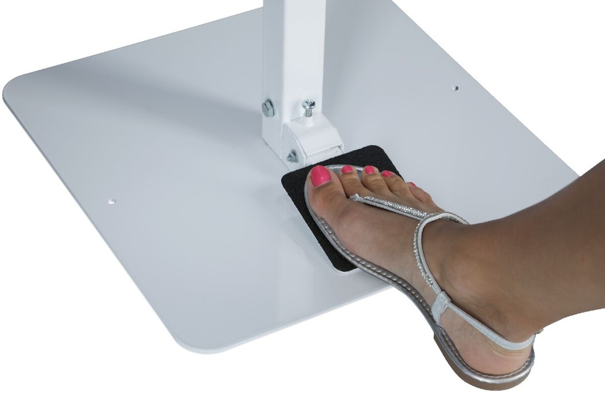 A fertőtlenítú adagja felszabadul, miután lenyomta a pedált az állvány alján, és így a kezek nem érintkeznek az állvánnyal. A körülbelül 3 cm átmérőjű lyuk lehetőséget nyújt különféle fertőtlenítőszerek rögzítésére. A fertőtlenítő állvány magassága a kívánt helyzetnek megfelelően változtatható az állvány oldalán található 2 csavar segítségével, ami garantálja a fertőtlenítő tartály különböző méretű használatát.