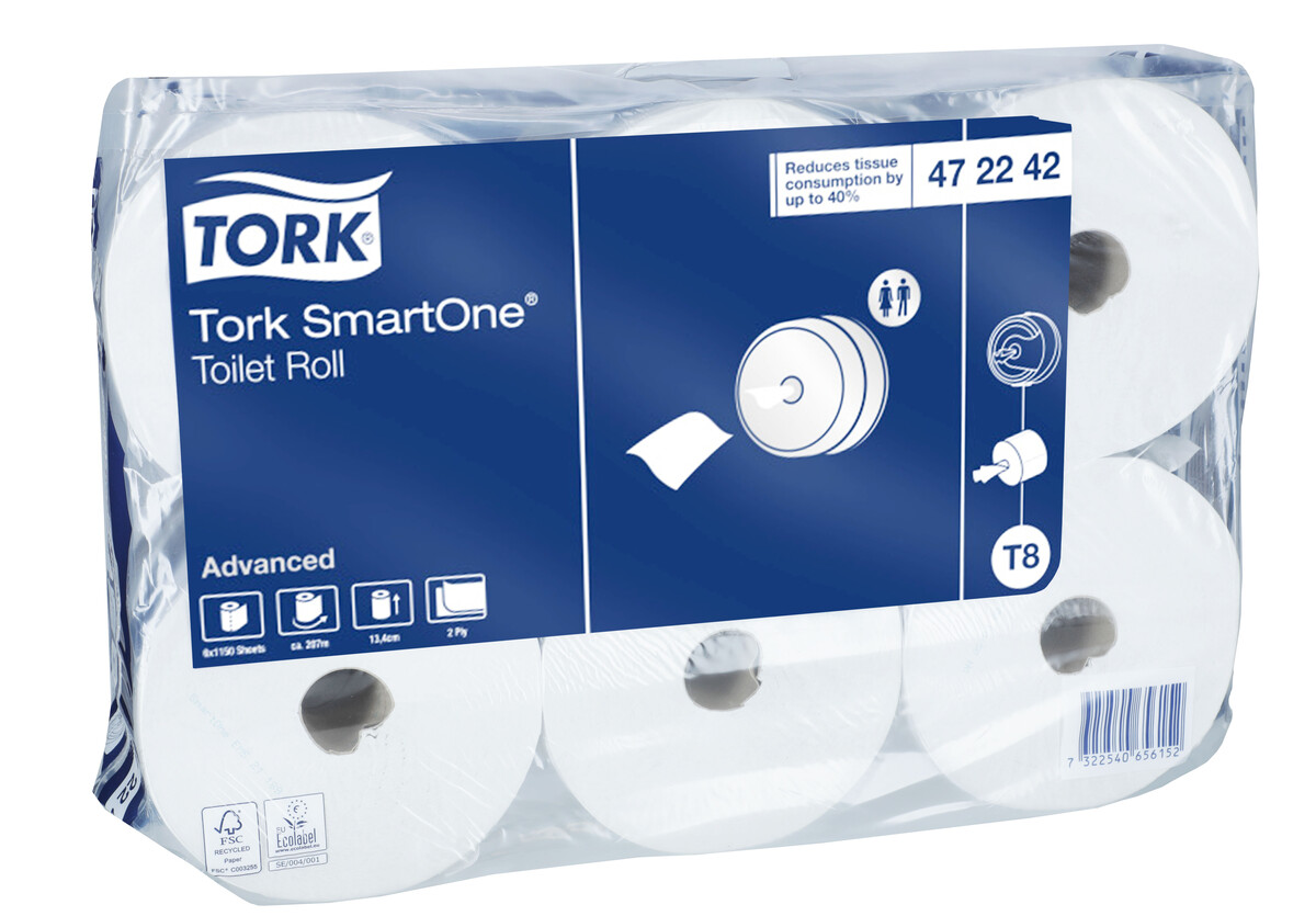 A Tork Smart One (T8) toalettpapír nagykiszerelésű tekercsben, központi letekeréssel és laponkénti adagolással akár 40%-kal csökkentheti a fogyasztást (a hagyományos automata Jumbo tekercsekhez képest). A papír kellemesen puha és egyben tartós is.