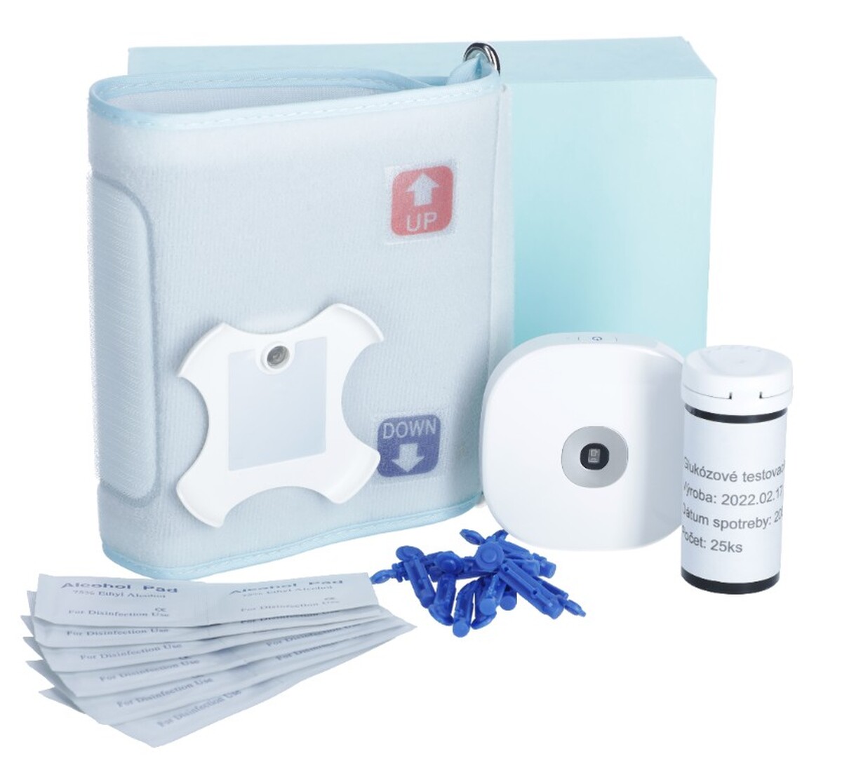A készülékhez tartozik egy speciális nyomásmérésre szolgáló mandzsetta (22-35 cm), amelyre rögzítve a készülék automatikusan elkezdi pumpálni bele a levegőt. A vércukorszint méréséhez 100 db tesztcsíkot, lándzsát és alkoholos törlőkendőt adunk az ujjak mintavétel előtti fertőtlenítésére.