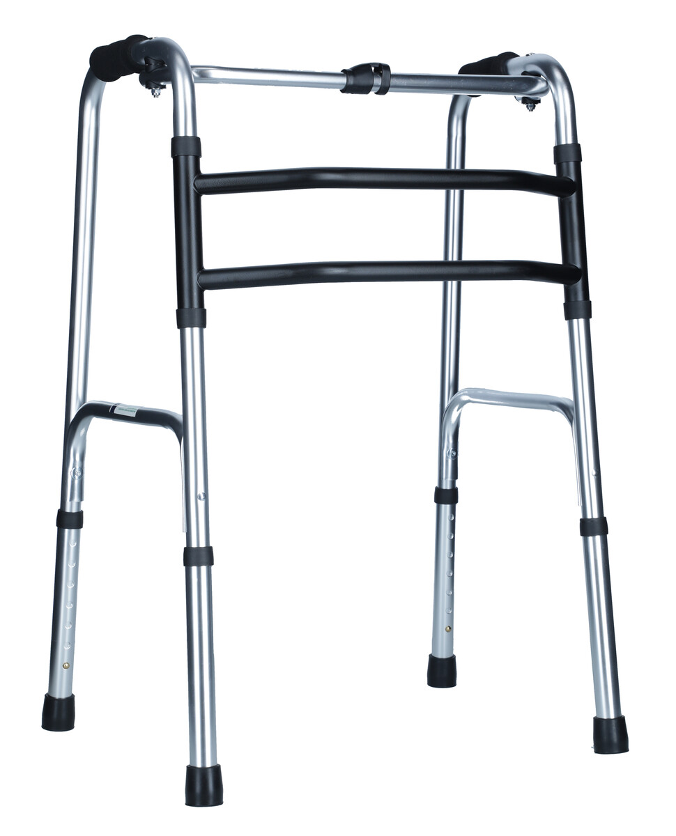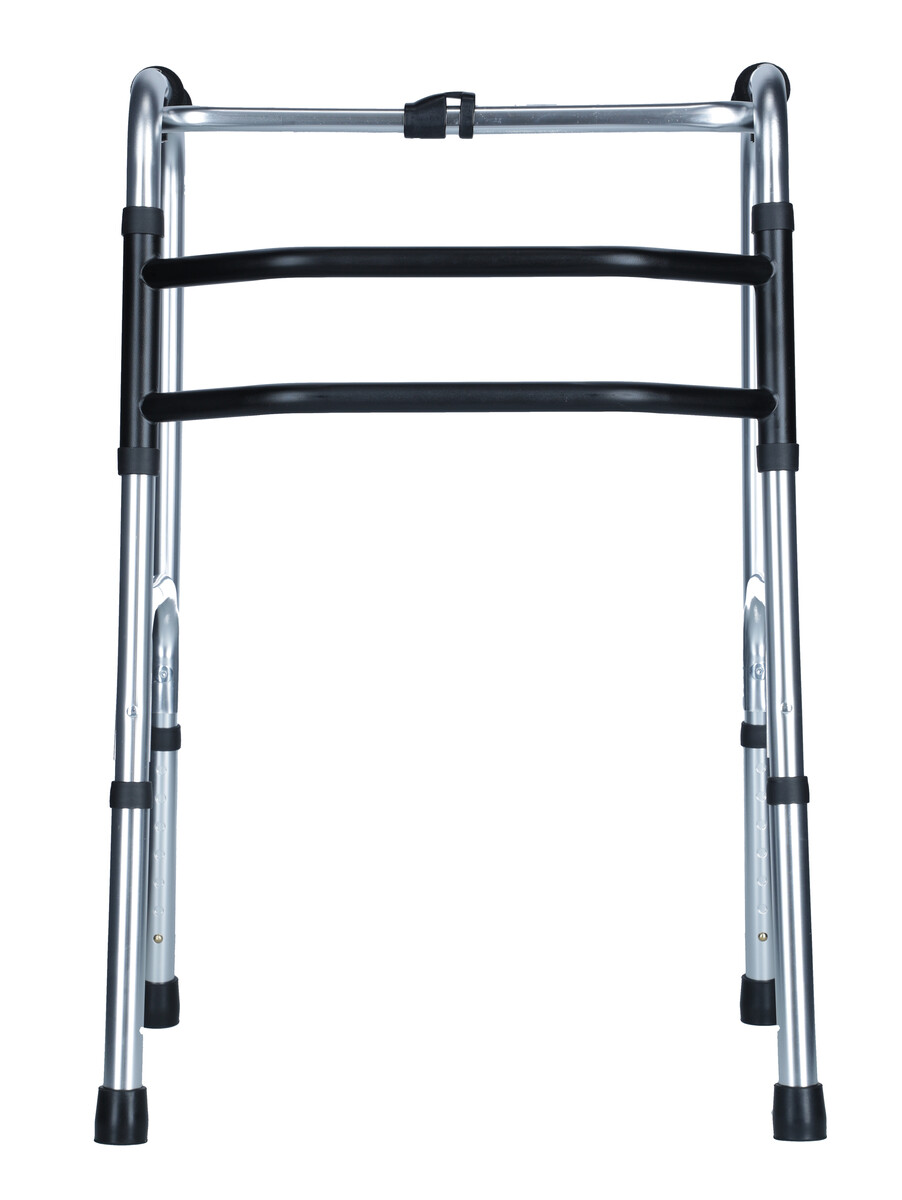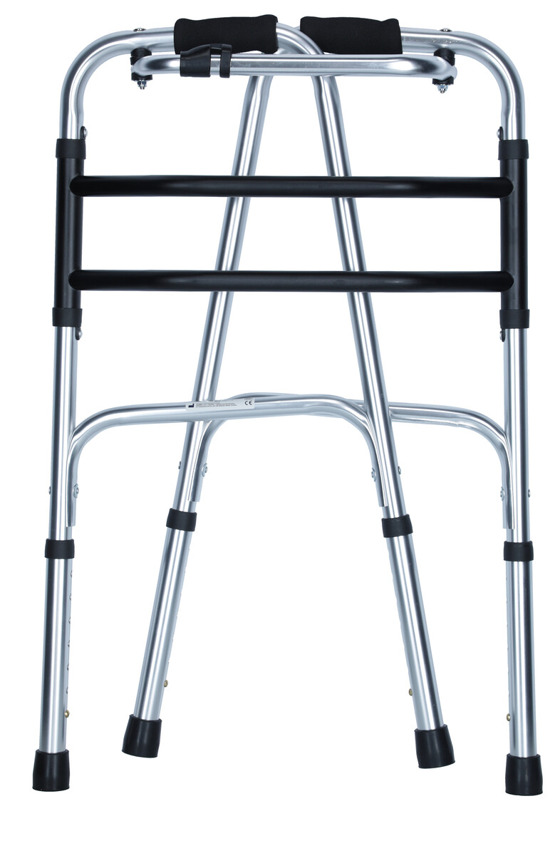 A szilárd összecsukható járókeret olyan személyek számára készült, akik séta közben segítségre szorulnak. Könnyű, tartós eloxált alumínium váza gyors és biztonságos mozgást biztosít. Annak érdekében, hogy a felhasználó kényelmesen érezze magát, a járókeret magassága a lábakon lévő gombok megnyomásával állítható.