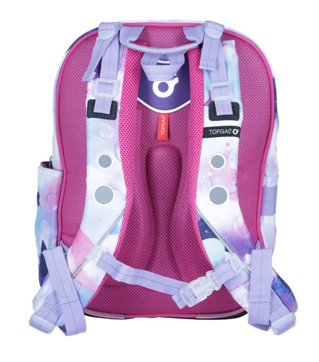A puha préselt habszivaccsal megerősített háttámla , megerősített állítható vállpántok és mellkasi öv gondoskodik az iskolatáska megfelelő rögzítéséről a háton . A hevederek anatómiailag formáltak és az alakhoz igazodva rögzítik a felső és alsó részeket , aminek köszönhetően még a gyermek kis hátán is megfelelően ülnek. A pántok végei mágnessel vannak ellátva, így nem akadályozzák viselés közben. Az állítható magasságú mellkaspánt biztosítja, hogy a hevederek még keskeny vállról sem csússzanak le.