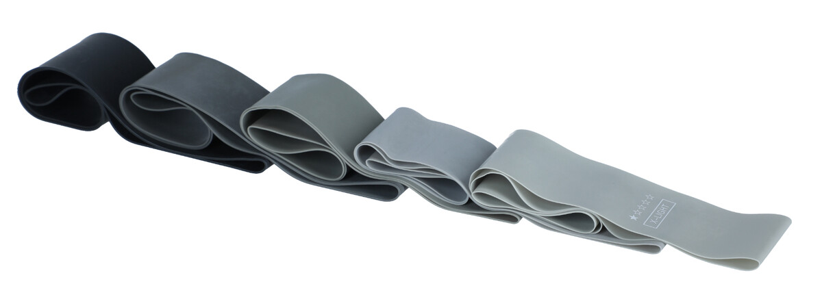 Az ötfokozatú ellenállású erősítő gumiszalag különböző korosztályú nők és férfiak számára egyaránt alkalmas. Aerobikhoz, jógához, pilateshez, erősítéshez, fitneszhez vagy rehabilitációs edzésekhez sérülés után, illetve alakformáláshoz használható. Ajánlott ülőmunka esetén, valamint a jó fizikai kondíció megőrzéséhez is. Segít az izomcsoportok erősítésében és nyújtásában, szinte az egész testet megmozgatva.Erősítő gumiszalag készlet szürke - 5 darab