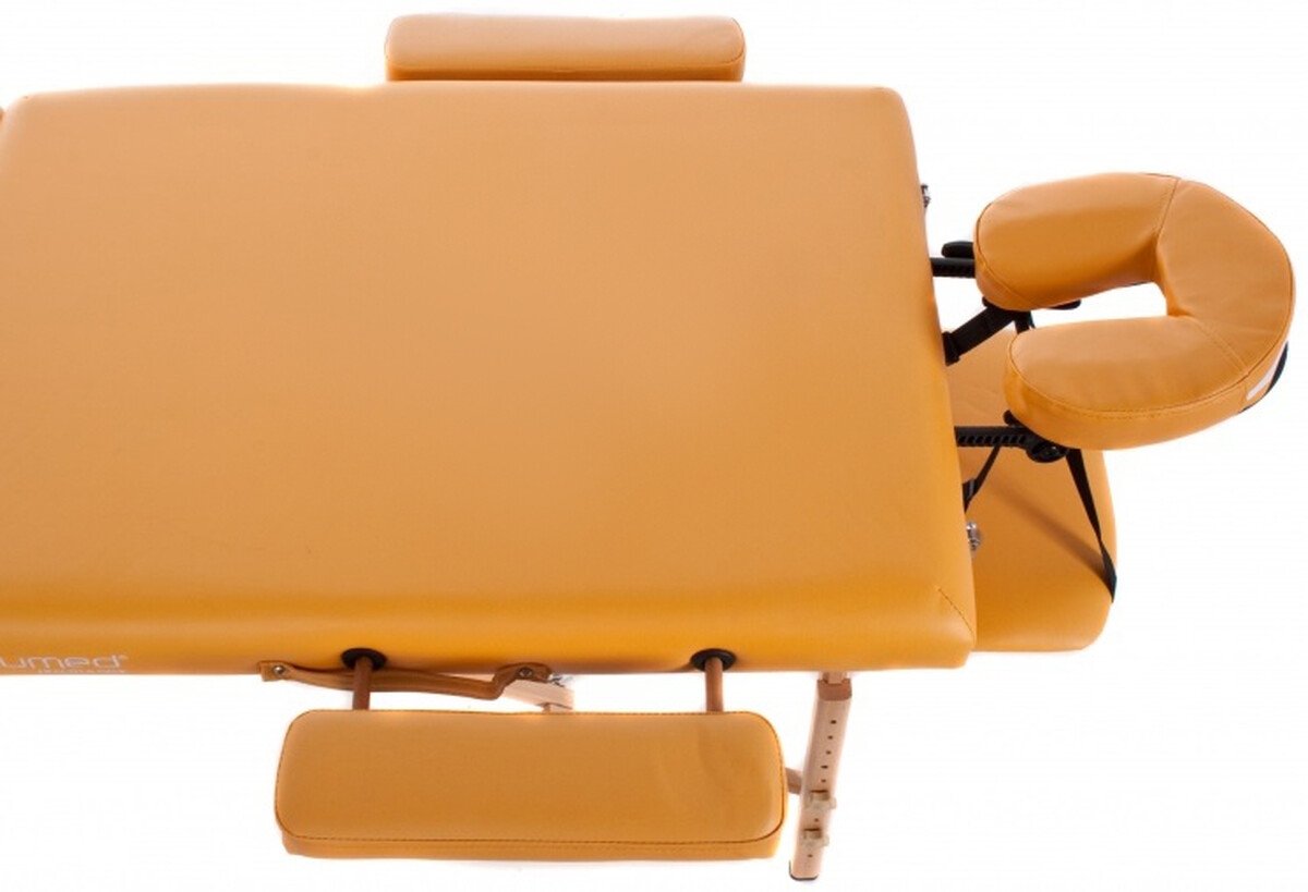 Összecsukható, fa masszázságy két nyílással az arc-részen, melyet széles, hosszú és kényelmes munkafelület jellemez. Felhasználható mint nyugágy szépségszalonban, vagy mint hordozható masszázságy.