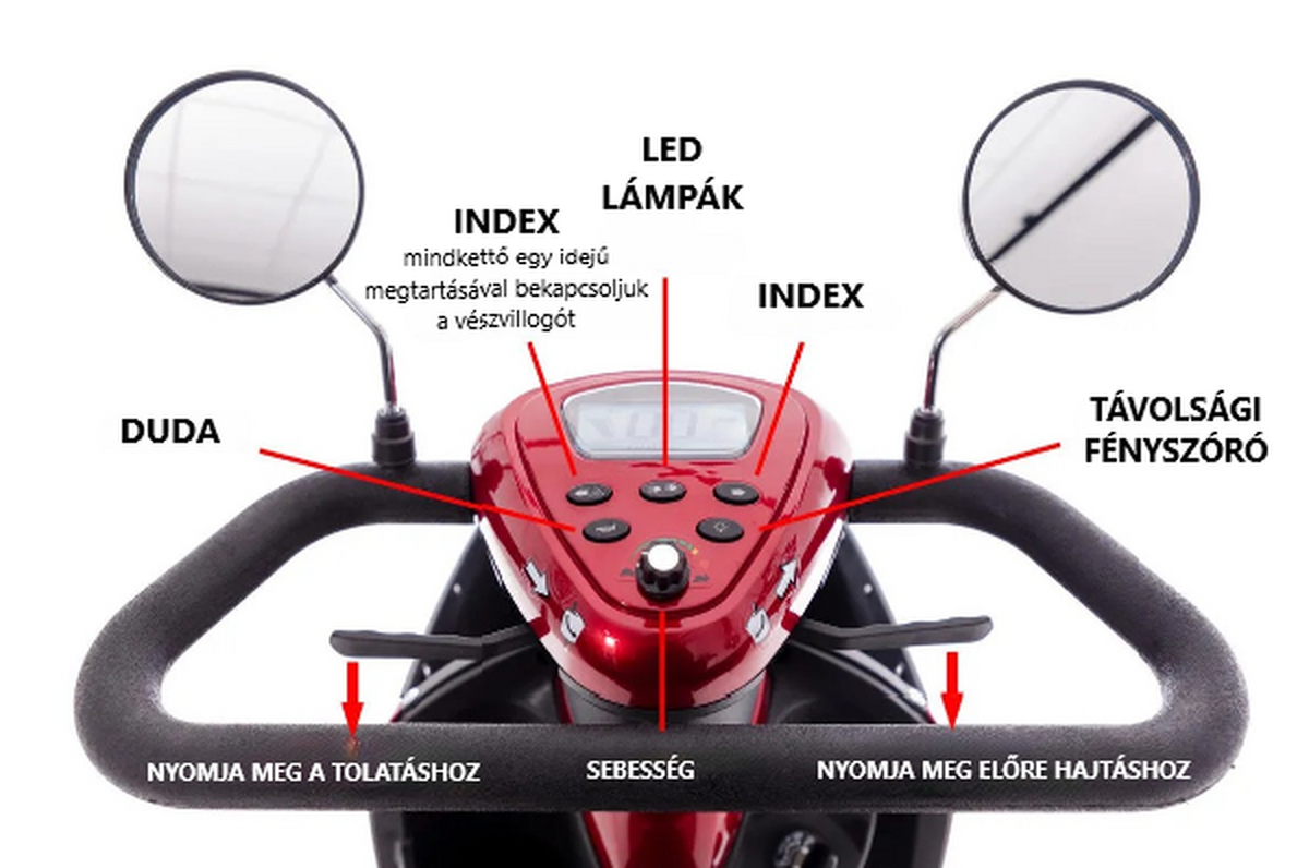 A MOBILITY PLUS elektromos négykerekű robogót összeszerelt állapotban szállítjuk - csak a visszapillantó tükröket kell rögzíteni.