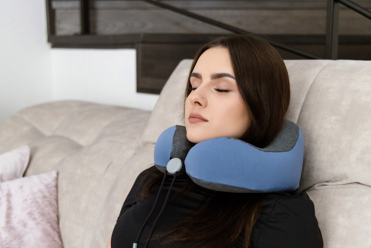 Anatómiailag kialakított utazópárna a fej megtámasztására alvás és pihenés közben, ideális hosszabb utakhoz vonattal, repülővel vagy busszal.