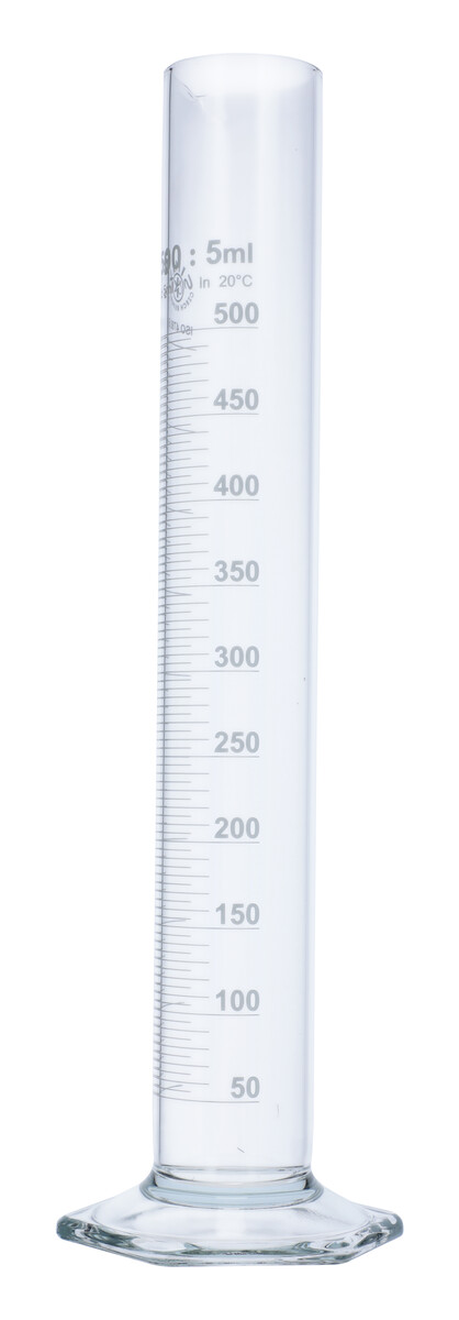 A henger boroszilikát üvegből készül, 5 ml-es beosztással és 2,5 ml-es pontossággal kalibrálva.