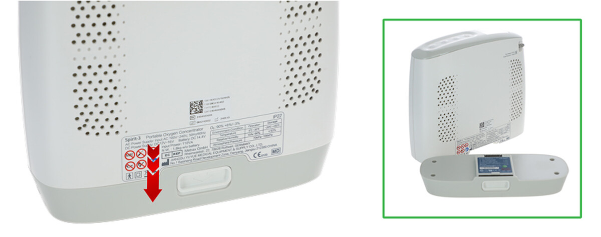 A hordozható oxigénkoncentrátor moduláris lítium akkumulátorral van felszerelve, amely normál elektromos aljzatból tölthető.A csomag részét képezi egy adapter is, amely 12 V-os autós gyújtásról történő táplálást tesz lehetővé. Az akkumulátor maximális töltési ideje körülbelül 3 óra 40 perc (teljesen lemerülttől teljesen feltöltöttig, az áramforrástól és a használattól függően).