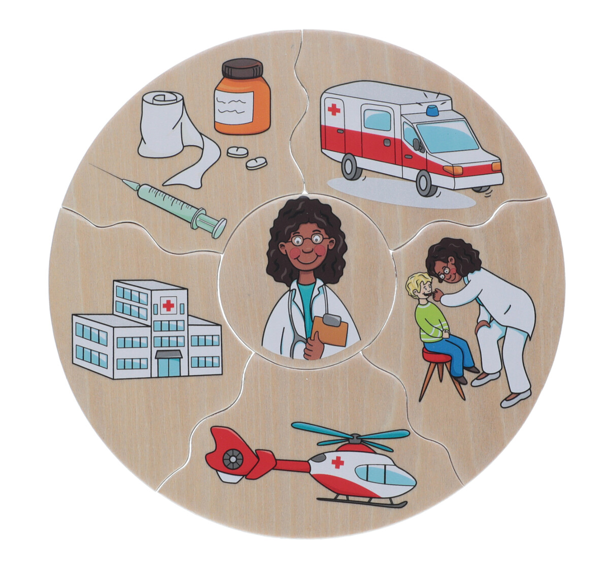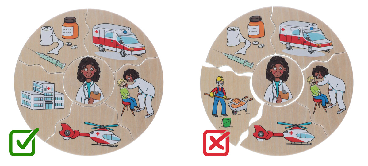A csomag 5 részből áll: orvos, gazda, tűzoltó, építész és rendőr. Minden szakmát további 6 illusztrált darab jellemez, amelyek úgy illeszkednek egymáshoz, mint egy puzzle. A képeken munkaeszközök, járművek, vagy a munkavégzés helye található. A feladat tehát az, hogy az egyes részeket hozzárendeljük a megfelelő munkához.