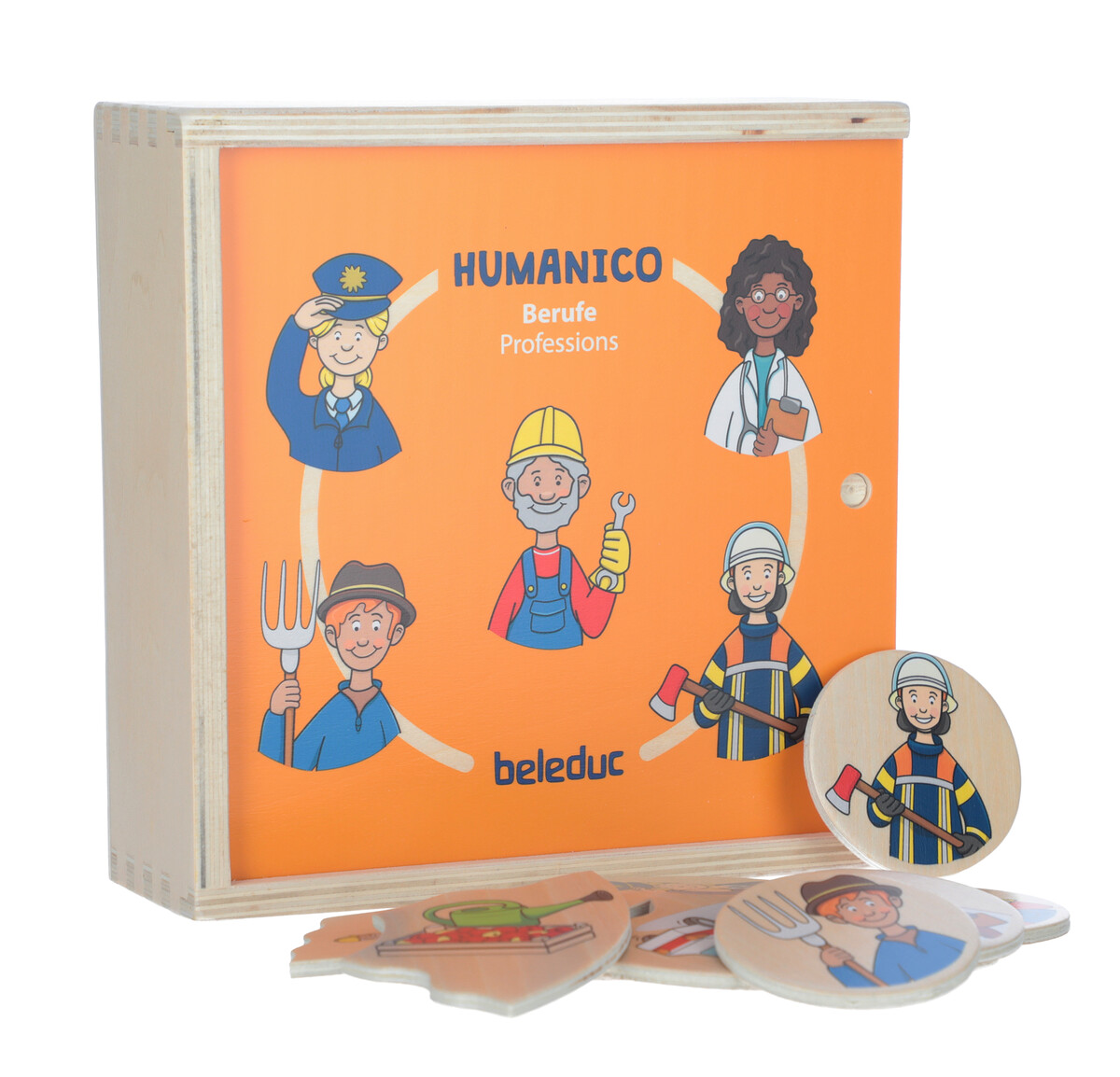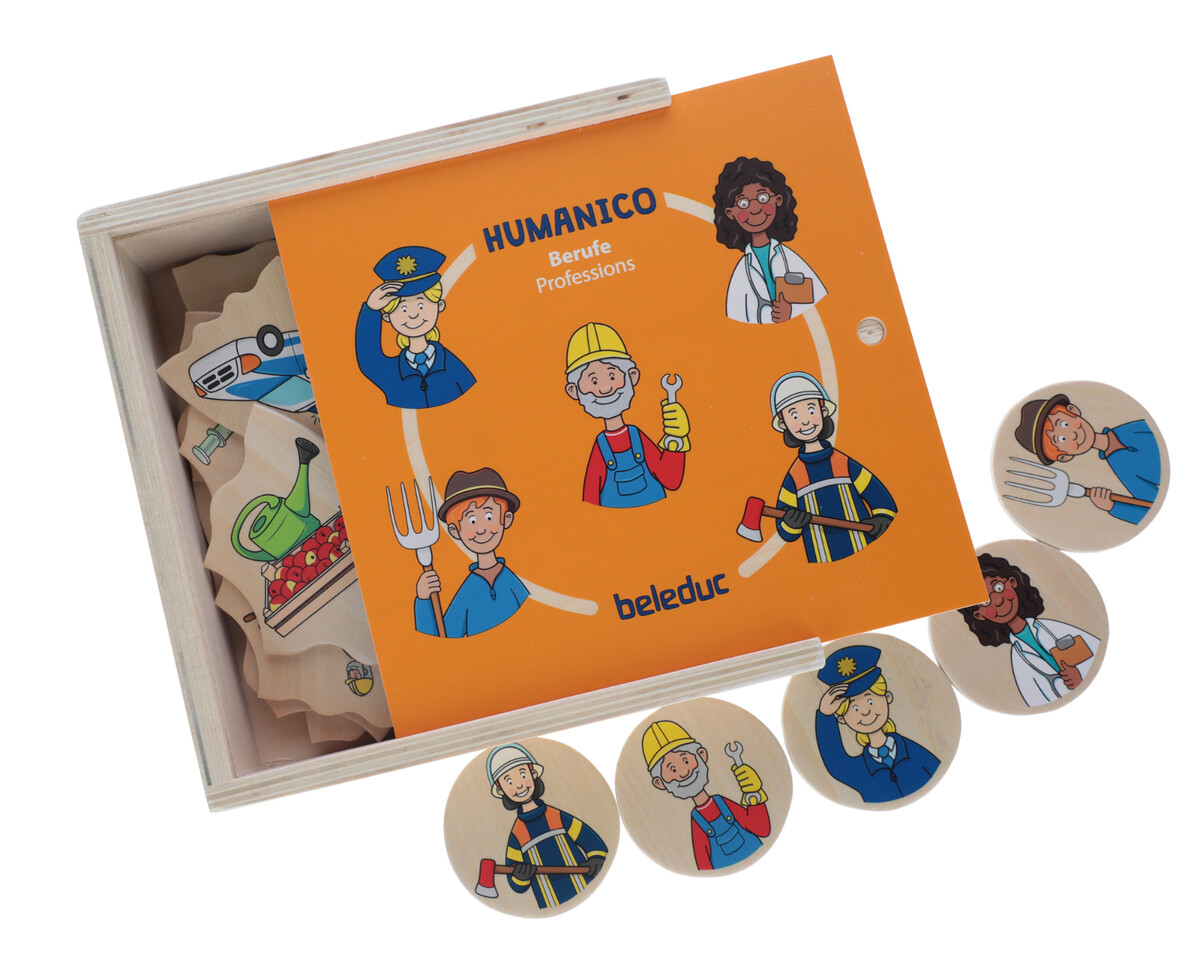 A Beleduc 2 az 1-ben Humanico Szakmák játék és puzzle egy 30 darabból álló puzzle 5 foglalkozási témával. Ez egy gyakorlati oktatási játék, amely segíti a gyerekek szociális-érzelmi tanulását, logikus gondolkodását, koordinációját és kommunikációs készségeit.