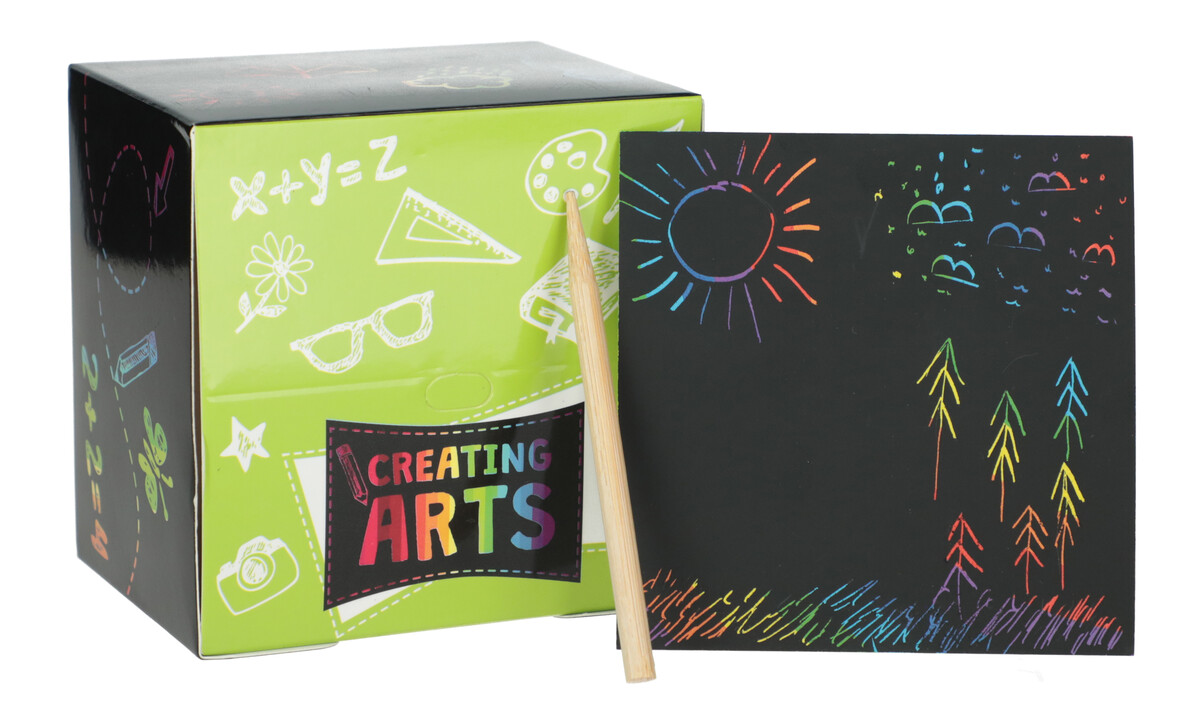 Élénk színek rejtőznek a fekete felső réteg alatt, amely lehetővé teszi, hogy színes képeket készítsen karcolással és a felületre rajzolással .
