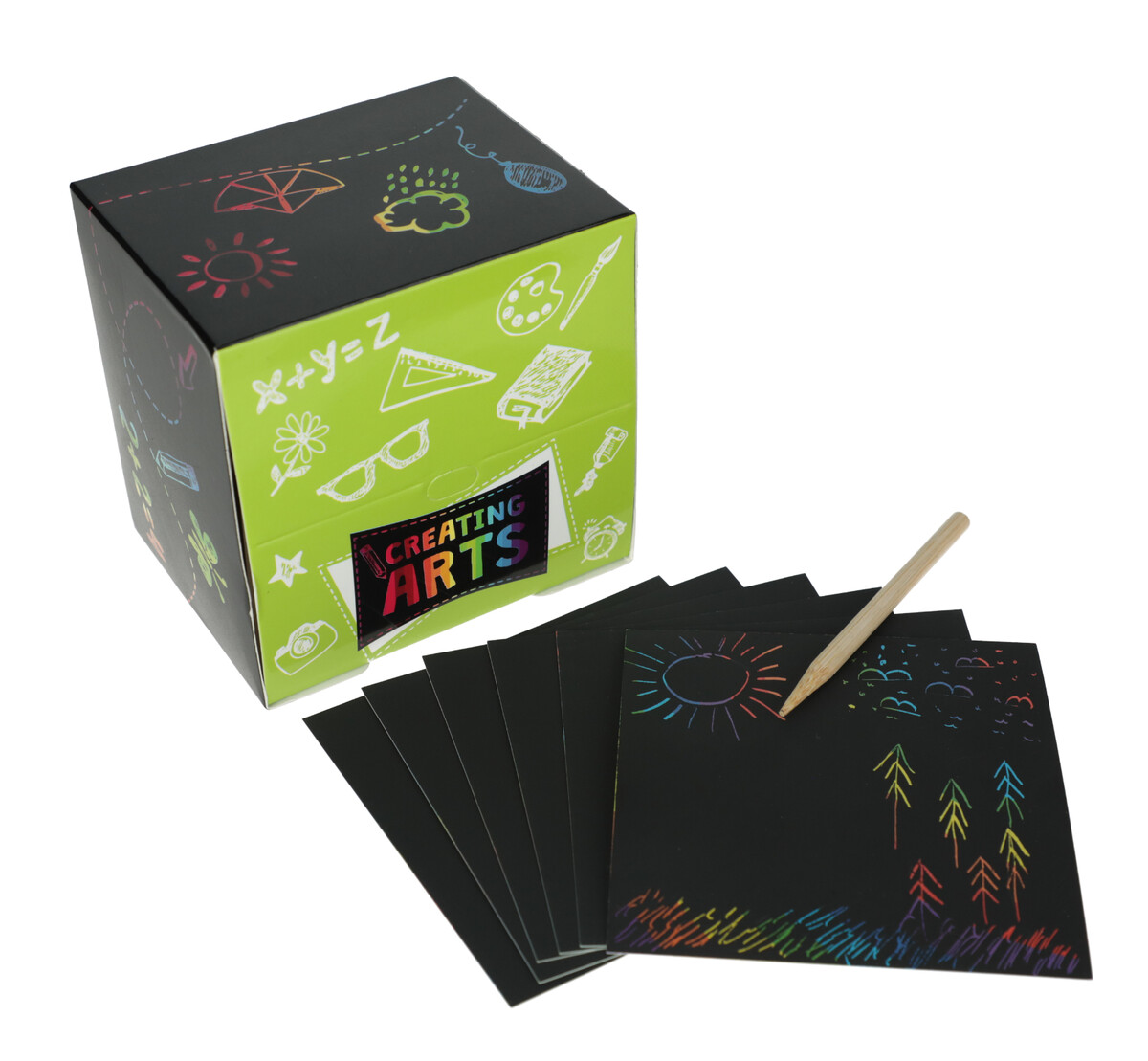 Minden csomag 200 db papírlapot tartalmaz, melyeket a mellékelt 24 db fapálcikával díszíthet – tinta vagy zsírkréta használata nélkül .
