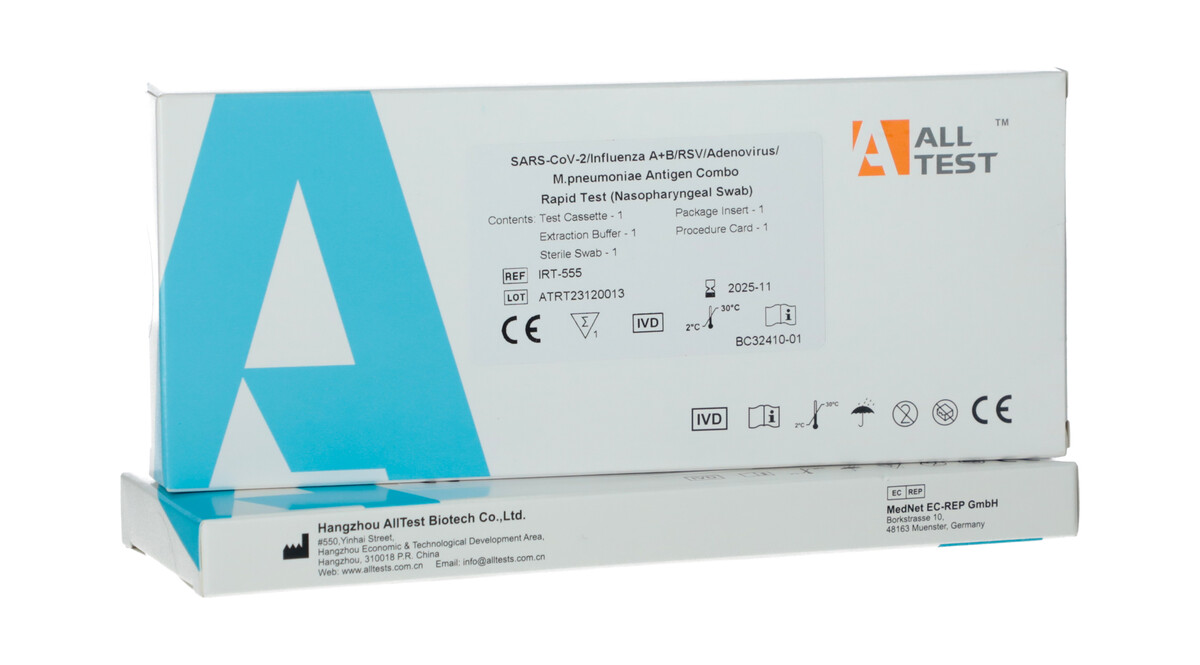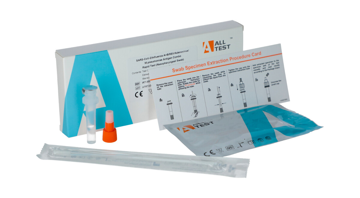 Antigén kombinált gyorsteszt SARS-CoV-2, Influenza A+B, RSV, Adenovírus, Mycoplasma pneumoniae kimutatására.
