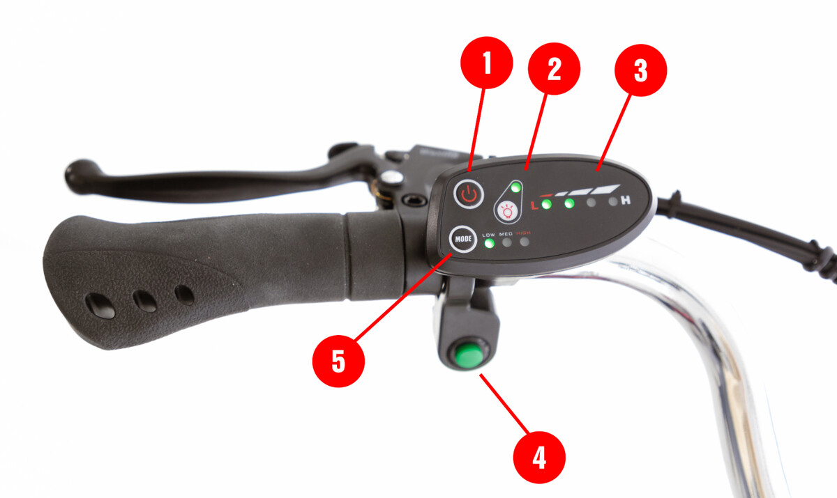 A kerékpár vezérlése egyszerűen egy forgó szabályozóval és egy fényjelzéssel ellátott kezelőpanel segítségével történik. Az átlátszó vezérlőegységen a következőket találja: