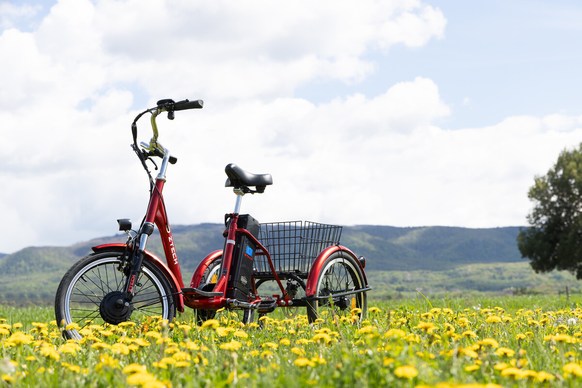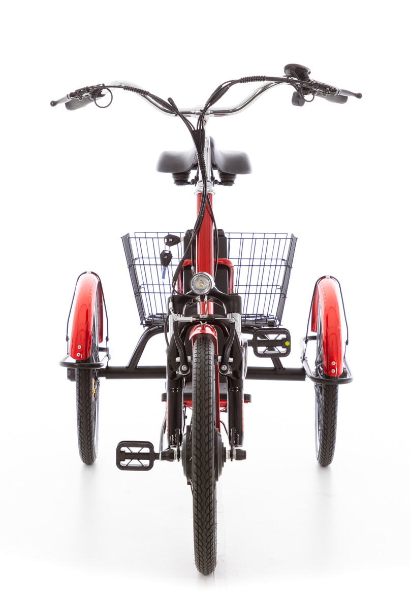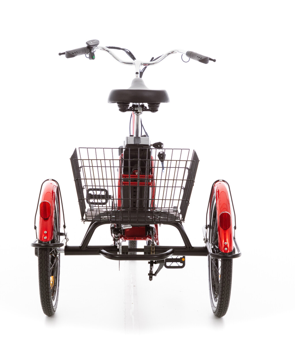 Praktikus és könnyen kezelhető háromkerekű kerékpár idősebbek számára, kiegészítő elektromos hajtással és bőséges tárolóhellyel.