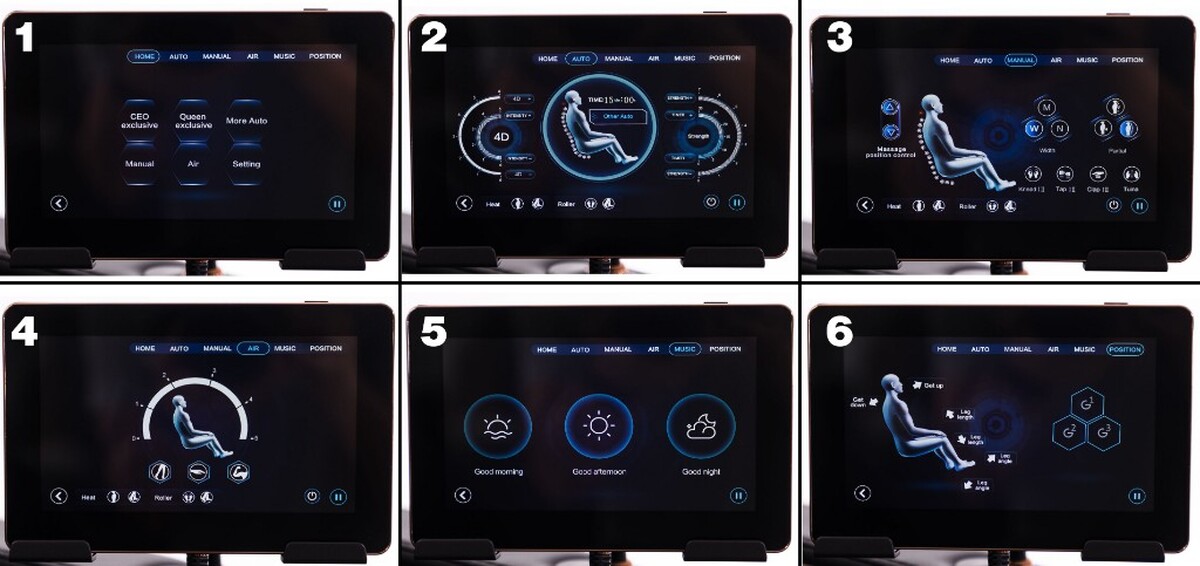 Minden választott üzemmódban lehetőség van a masszázs időtartamának kiválasztására 5-től 30 percig, valamint az 4D masszázsfej intenzitásának és nyomásának beállítására. Emellett lehetőség van a fűtés külön aktiválására vagy deaktiválására a lábaknál vagy az egész hátsó testnél, vagy mindkettőnél egyszerre. Nem hiányzik a légpárnák intenzitásának választásának lehetősége sem.