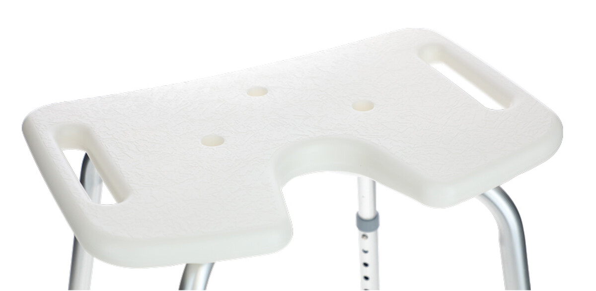 Állítható magasságú, anatómiailag formázott zuhanyzó szék megkönnyíti a higiéniát a mozgáskorlátozott személyek számára.