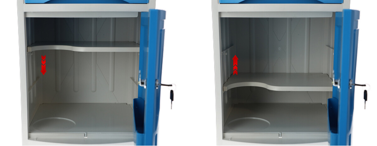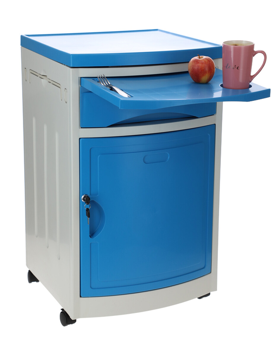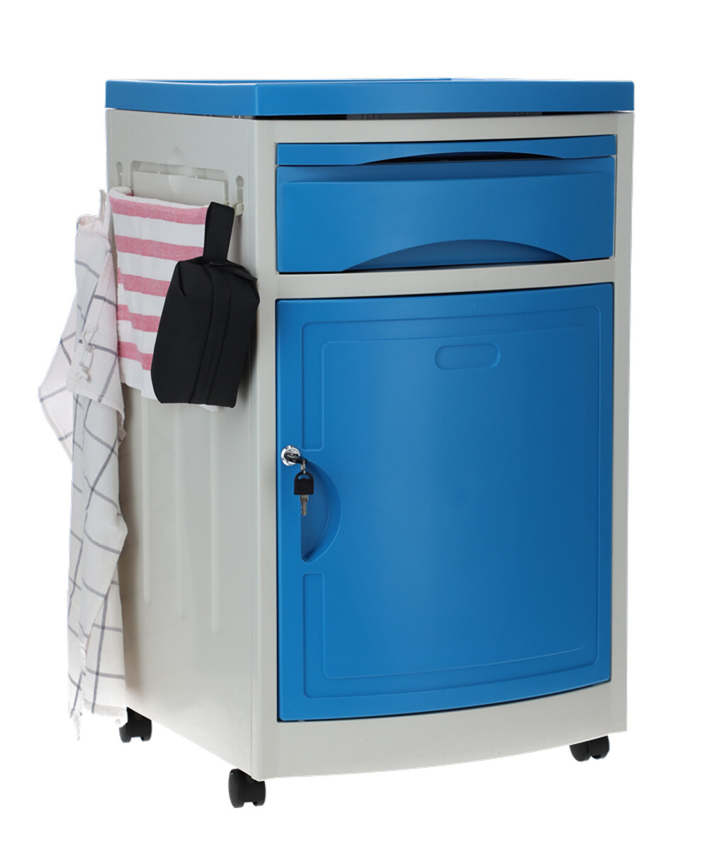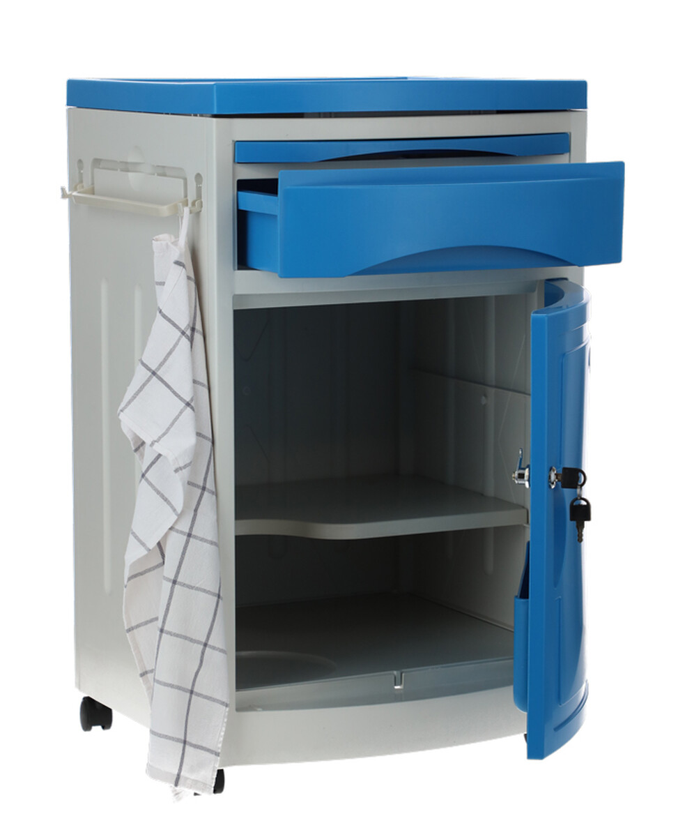 A kórházi éjjeliszekrény állítható ágyakhoz bőséges tárolóhelyet kínál. Az alap szekrényen és fiókon kívül kihúzható étkezőfelülettel és praktikus oldalsó akasztókkal is fel van szerelve.