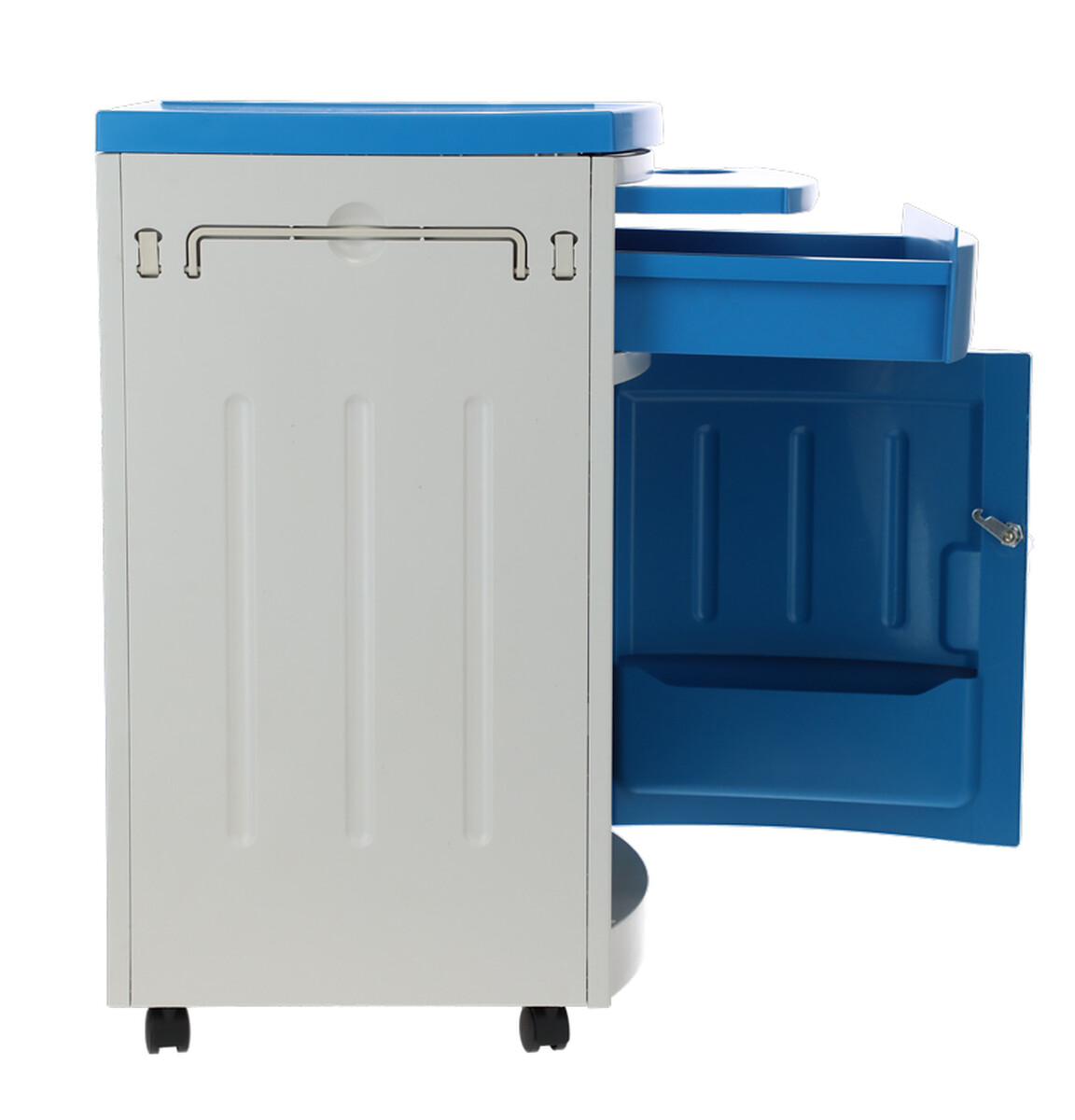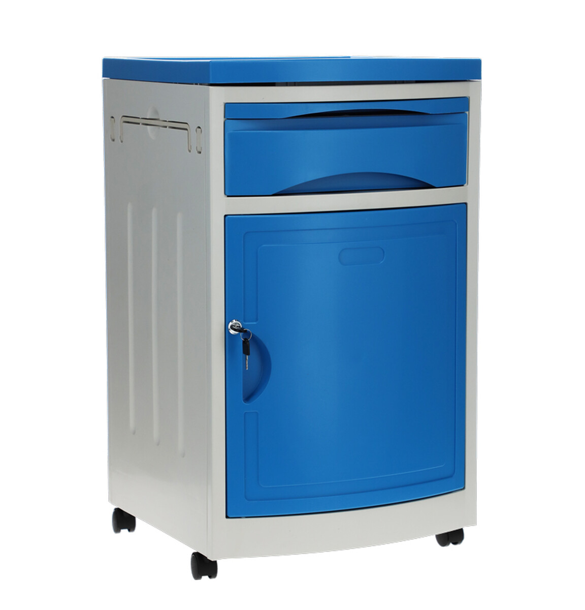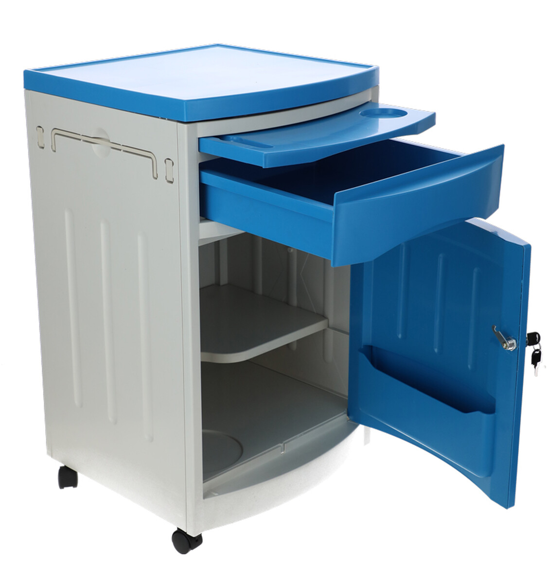 A kórházi éjjeliszekrény állítható ágyakhoz bőséges tárolóhelyet kínál. Az alap szekrényen és fiókon kívül kihúzható étkezőfelülettel és praktikus oldalsó akasztókkal is fel van szerelve.