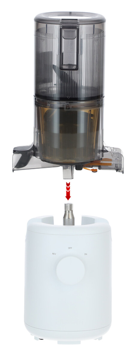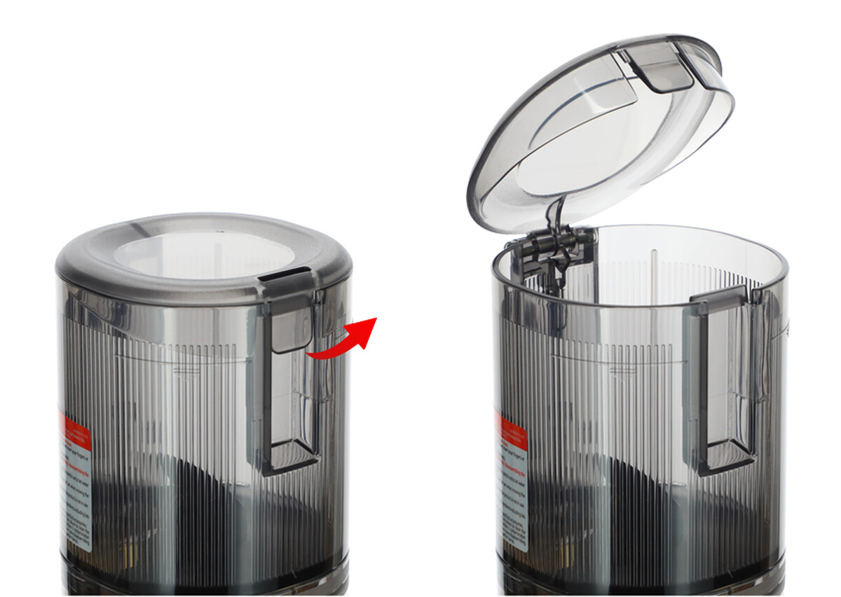 A készülék összeszerelése és szétszerelése egyszerű, intuitív módon történik. A tartály fedele biztonságosan nyitható és zárható bármikor a használat során – ha kinyitja, a gyümölcsprés automatikusan leáll, és a fedél bezárásával a préselési folyamat újra elindul.