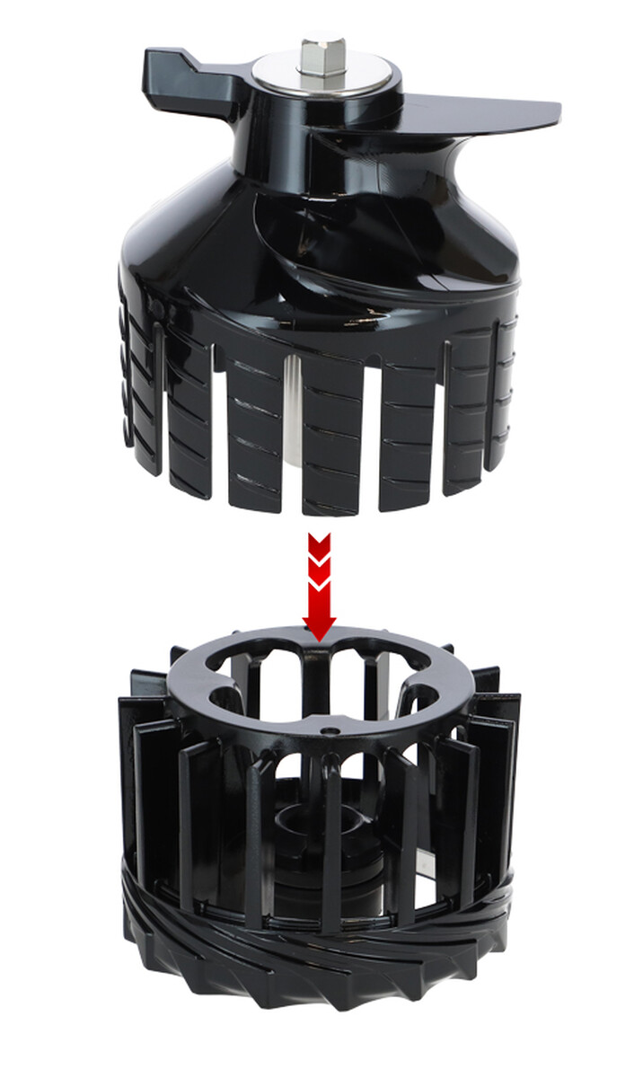 A hagyományos szitákkal ellentétben, ahol a maradékok fokozatosan leülepednek, és alaposabb tisztítást igényelnek speciális kefékkel, a Multi-Auger menete minimalizálja a maradék átszűrődését, még szita nélkül is. A szűrő gyakorlatilag a kamrába van beépítve, és a kétdarabos Multi-Auger úgy illeszkedik bele, hogy a lehető legkevesebb maradékkal préselje ki a levet. A kétdarabos kialakításnak köszönhetően a menetes rész nagyon könnyen tisztítható – egyszerűen szétválasztható és leöblíthető folyó víz alatt. Így a karbantartás sokkal kevesebb időt vesz igénybe.