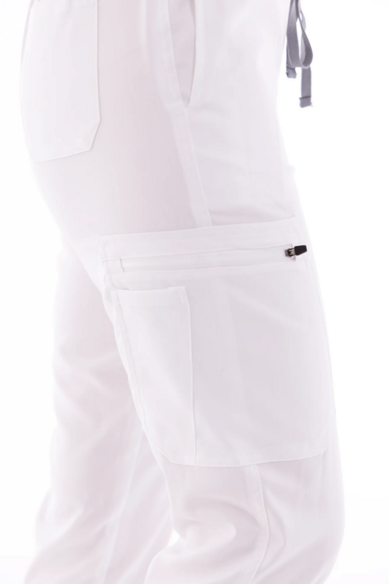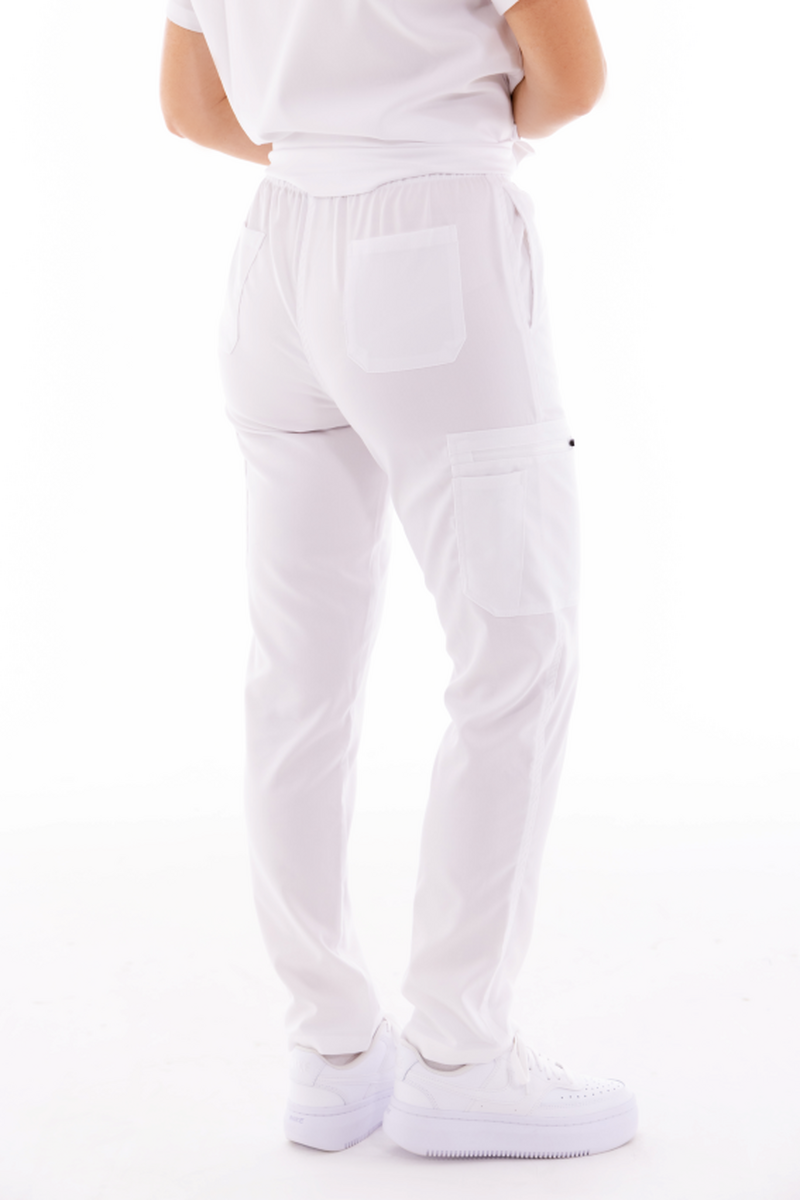 Női egészségügyi nadrág enyhén szűkített szabással, amely ötvözi a kényelmet, a praktikusságot és a stílust.