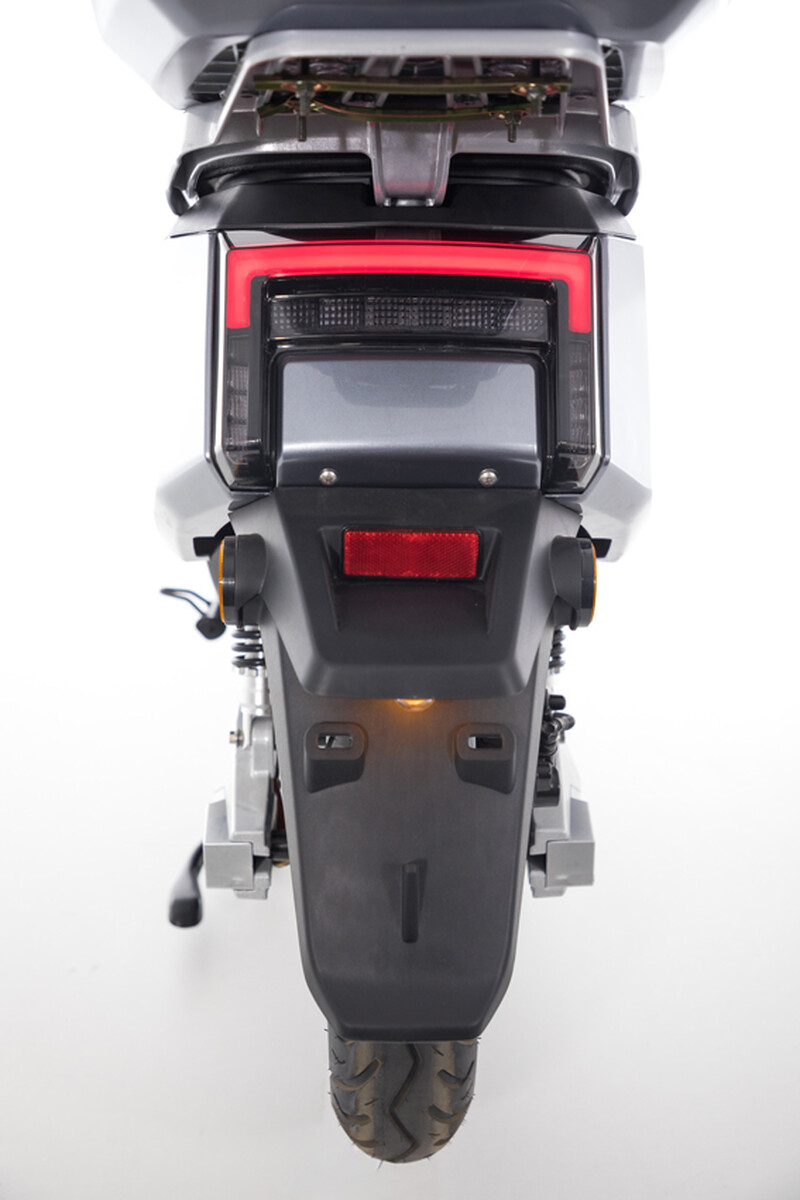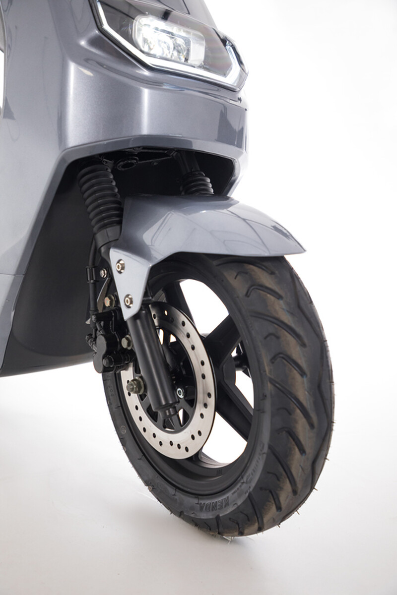Az elektromos robogó elöl és hátul tárcsafékkel van felszerelve, amelyek minden helyzetben gyors és megbízható fékhatást biztosítanak. A 100/80-12 méretű minőségi gumiabroncsok kiváló tapadást és stabilitást nyújtanak egyenetlen vagy gyengébb minőségű utakon is. A menetkényelmet tovább növeli az első és hátsó felfüggesztés, amely hatékonyan elnyeli az ütődéseket.