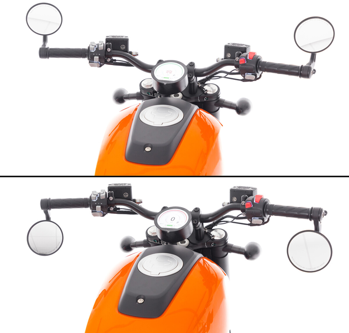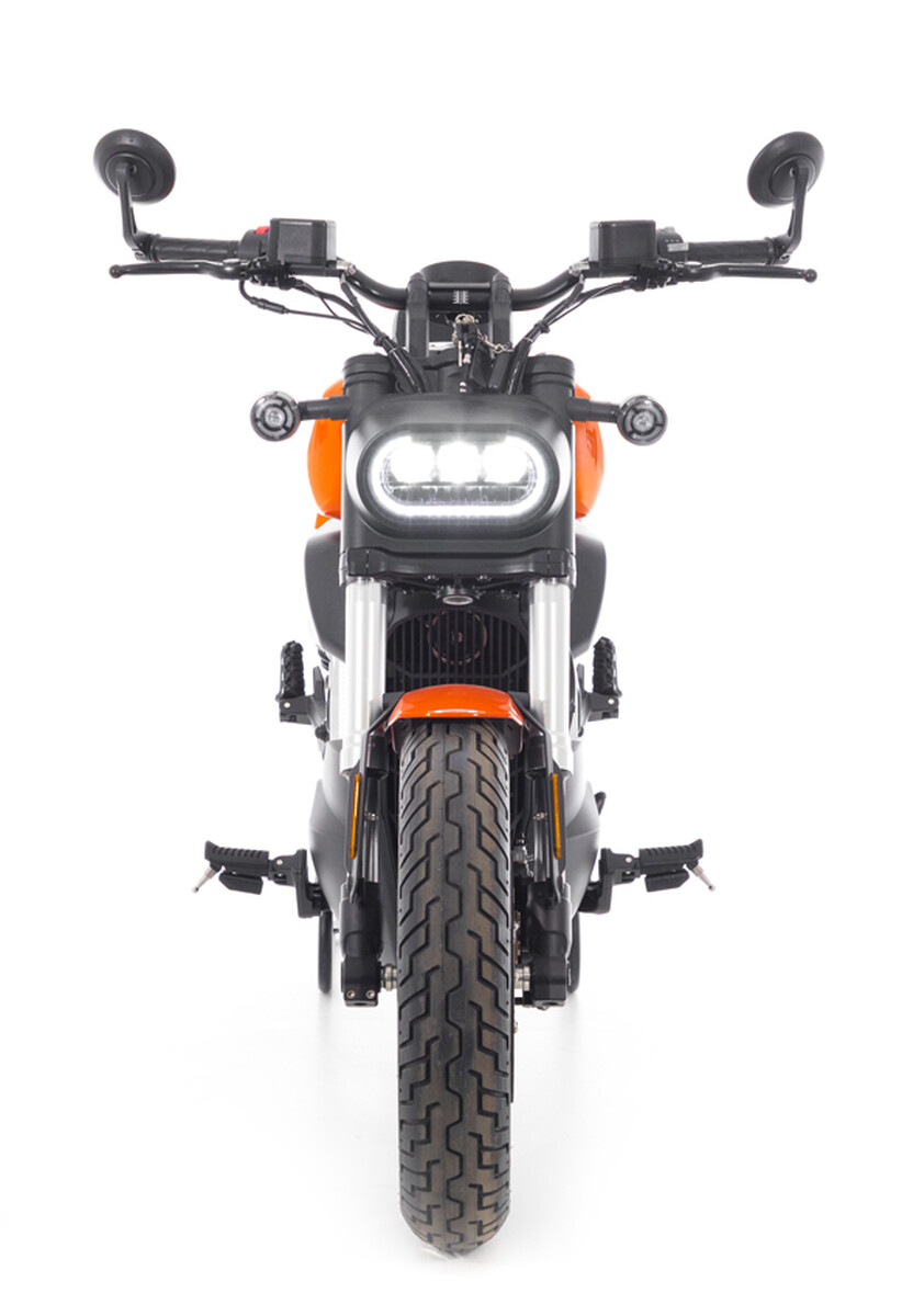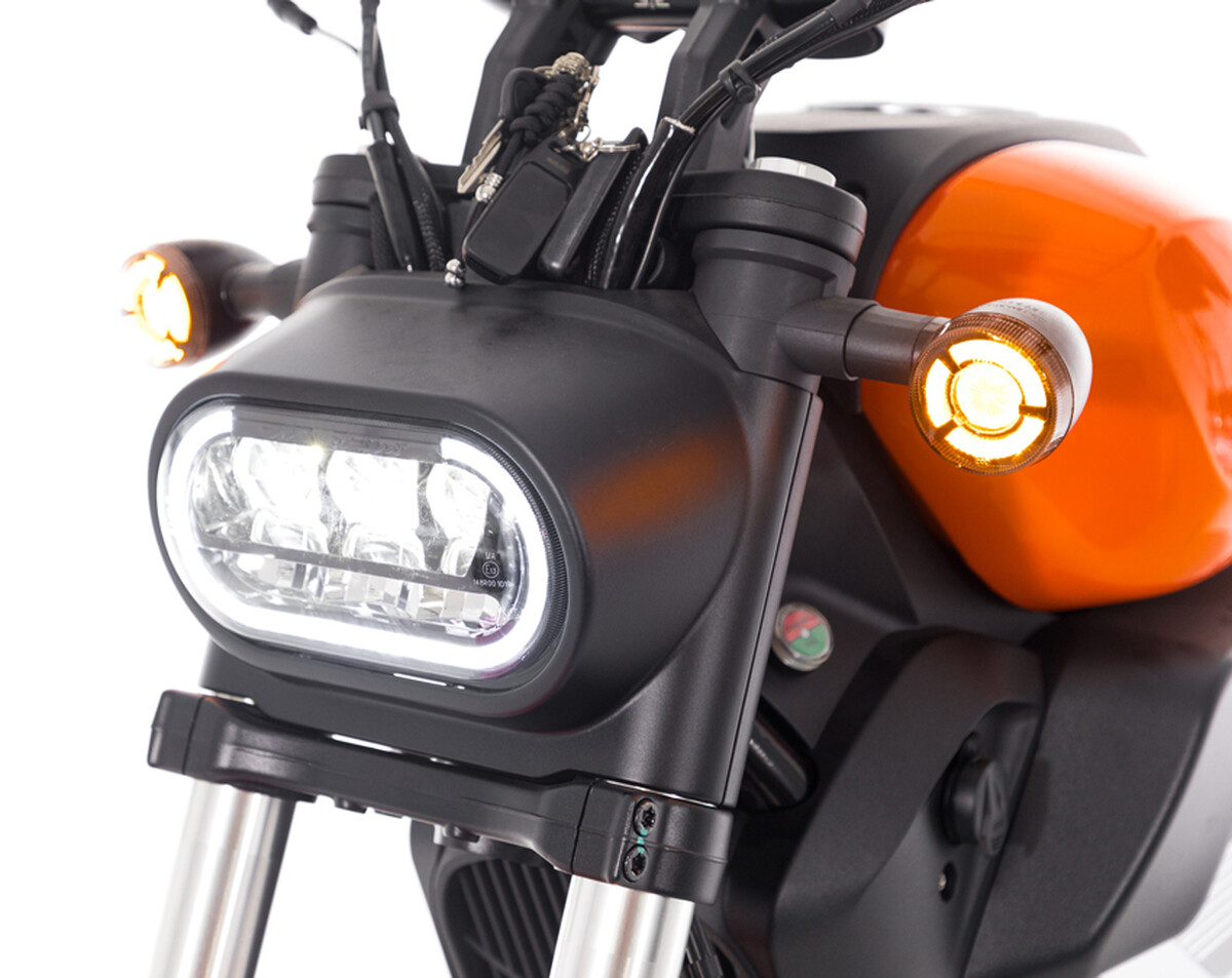 A retro megjelenést tovább erősítik a kerek visszapillantó tükrök, a széles, 720 mm-es kormány, valamint a markáns, ovális kialakítású központi LED fényszóró, amely háromlencsés rendszerrel rendelkezik. Ezek az elemek nemcsak látványosak, hanem kiváló láthatóságot biztosítanak gyenge fényviszonyok között is.