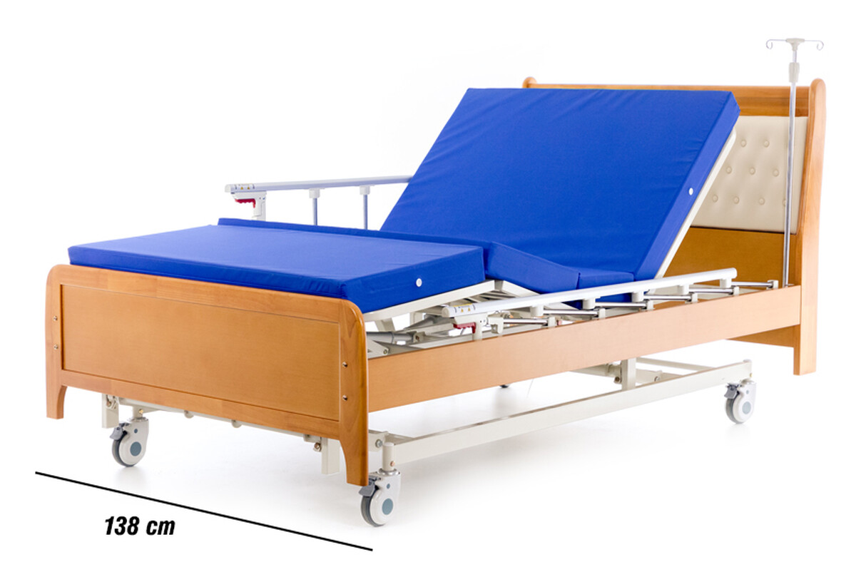 Az Elegance elektromos állítható ágy egy klasszikus egészségügyi ágy, amely ötvözi a bevált funkcionalitást az elegáns dizájnnal. Az ágy tágas, extra szélessége akár 138 cm, fa dekorral és kárpitozott fejtámlával rendelkezik, így harmonikus és otthonos hatást kelt a térben. Esztétikus kialakítása a praktikus funkciókkal kombinálva kényelmet és biztonságérzetet nyújt a páciens számára.