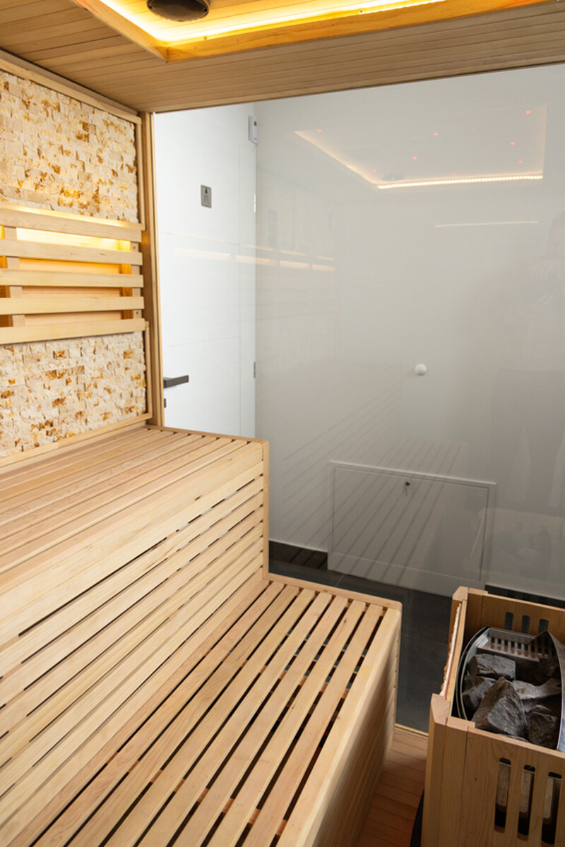 A belső teret a hátsó falon elhelyezett dekoratív kőburkolat egészíti ki, amely növeli a hőakkumulációt, és egyben hangsúlyozza a szauna prémium jellegét. A természetes fa, a kő és az üveg kombinációja harmonikus, időtálló megjelenést eredményez.