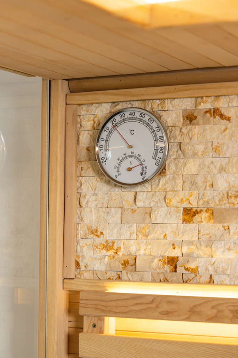 A szauna minden fontos elemmel fel van szerelve a biztonságos és kényelmes használathoz: kombinált hőmérő és páramérő, homokóra, fa vödör merőkanállal, valamint magas hőmérsékletnek ellenálló világítás. A dupla tetőszerkezet javítja a hőszigetelést, csökkenti a hőveszteséget, és hozzájárul az energiahatékony működéshez.