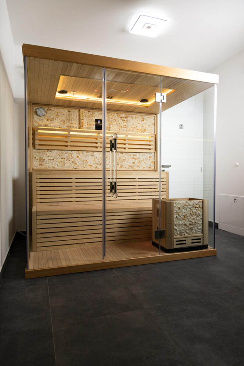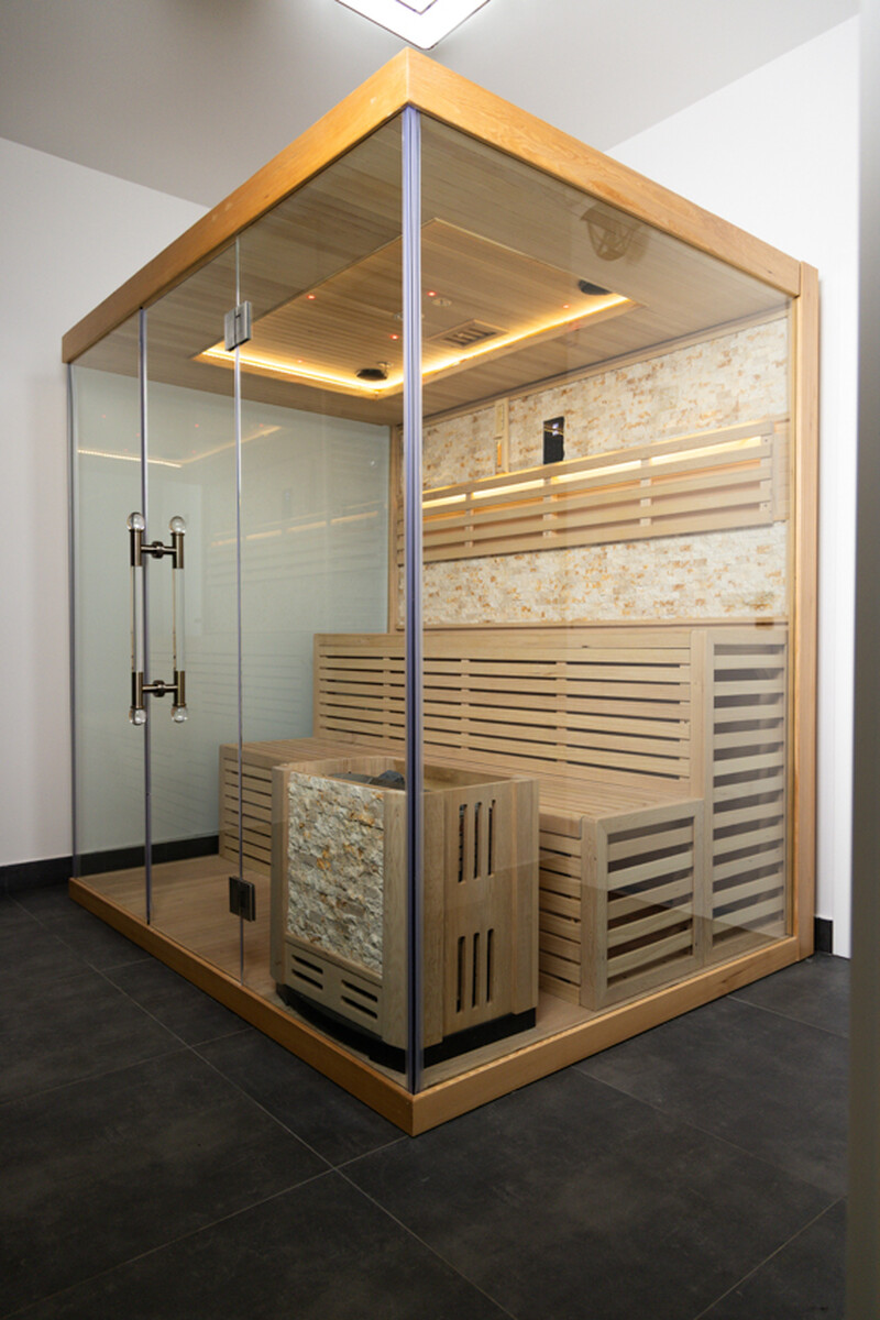 A dizájnos, üvegfalú szauna elektromos szaunakályhával ötvözi a prémium megjelenést az autentikus szaunaélménnyel. Ideális környezetet teremt a relaxációhoz, a regenerációhoz és az immunrendszer erősítéséhez.