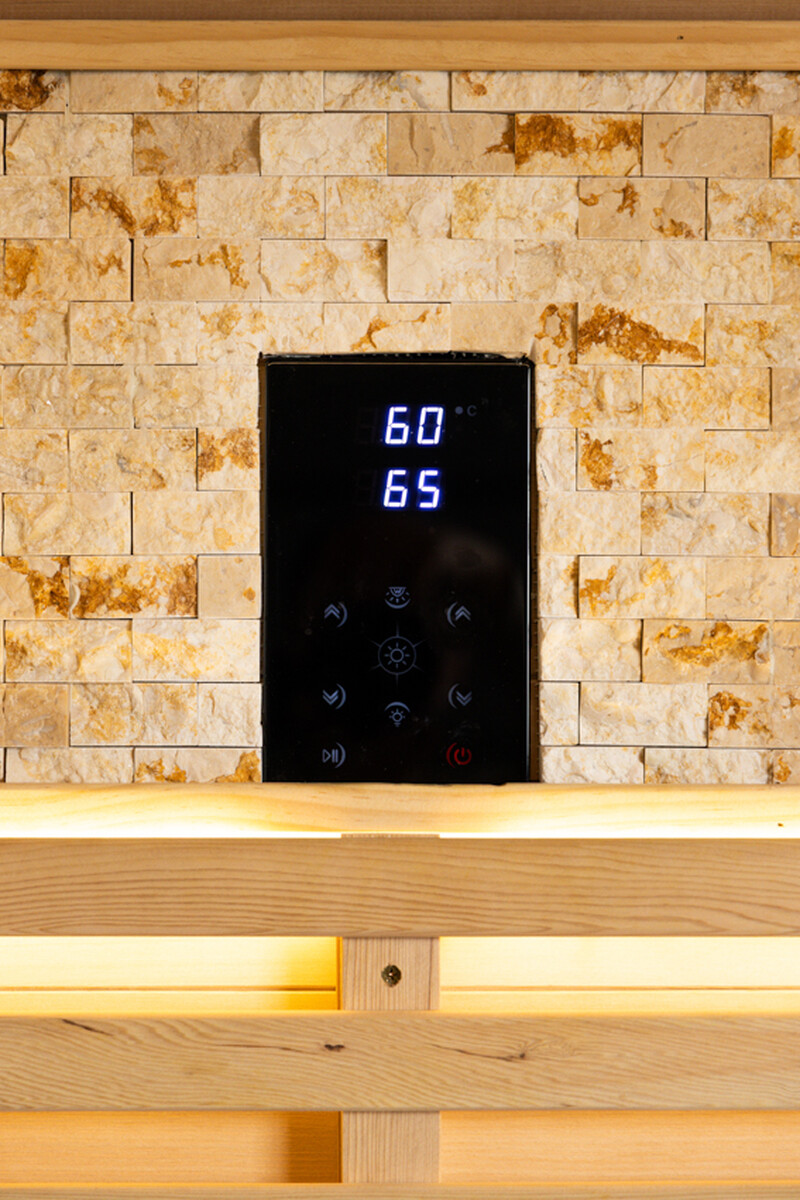 A szauna vezérlése Wi-Fi-s kezelőpanelen keresztül történik, amely lehetővé teszi a hőmérséklet és az üzemeltetés egyszerű, pontos beállítását. A szaunázás kényelmét tovább fokozzák az integrált hangszórók Bluetooth- és USB-támogatással, így relaxáló zenét is élvezhet a pihenés során. A kellemes hangulatot finom, színes LED-világítás teszi teljessé.
