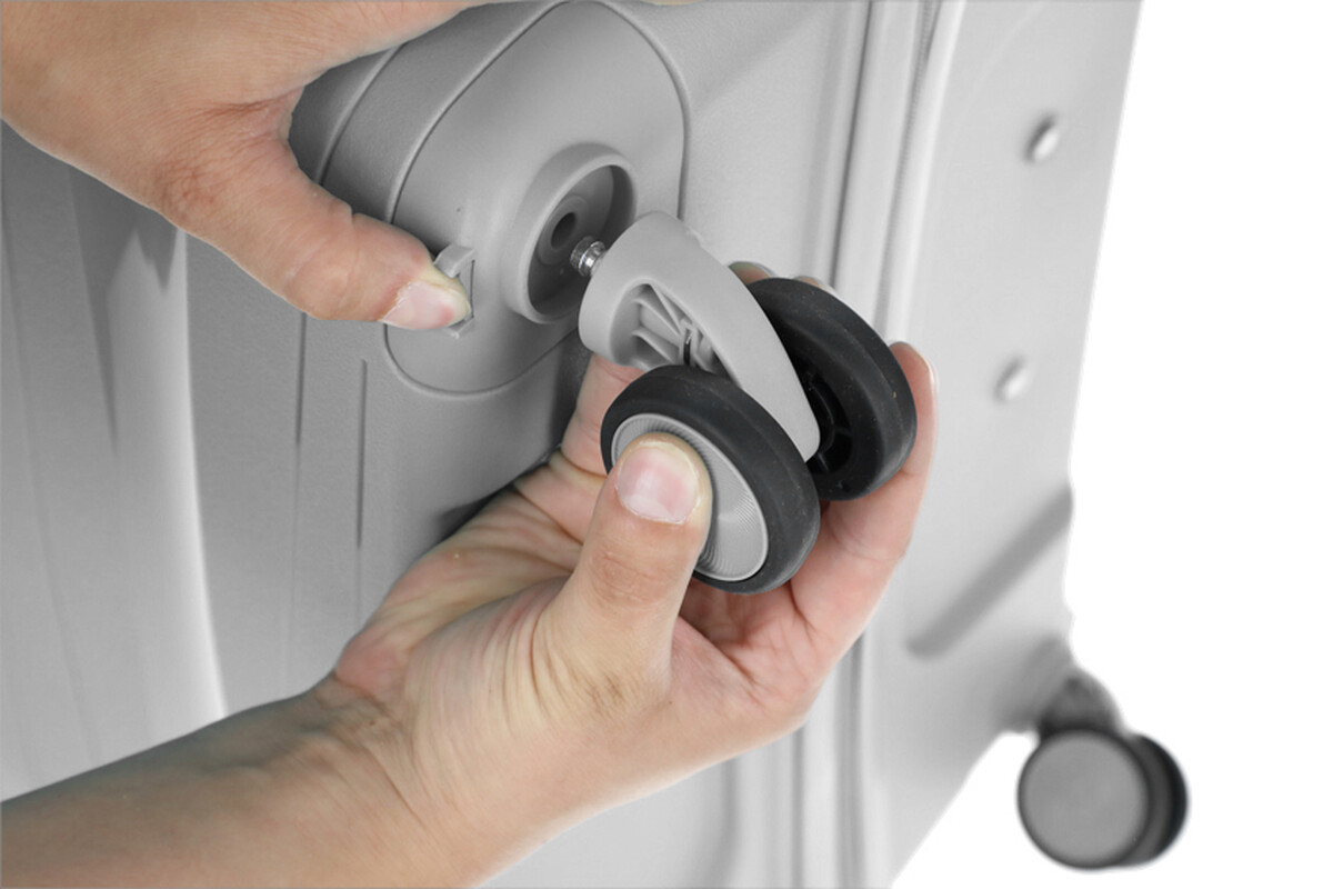 A négy, 360°-ban forgatható polipropilén kerék csendes és sima gördülést biztosít különféle felületeken. Praktikus előnye a „click” rendszer, amely lehetővé teszi a kerekek egyszerű leszerelését szerszám nélkül (csak az S/32 l és XL/109 l méretű bőröndöknél), amit különösen hasznosnak találhat tárolásnál vagy szűk helyen történő szállítás esetén.