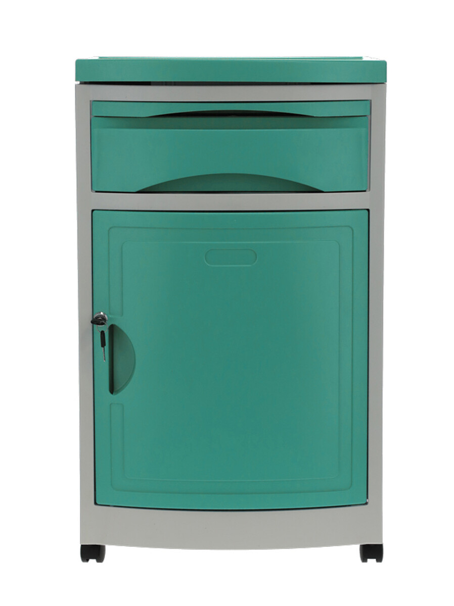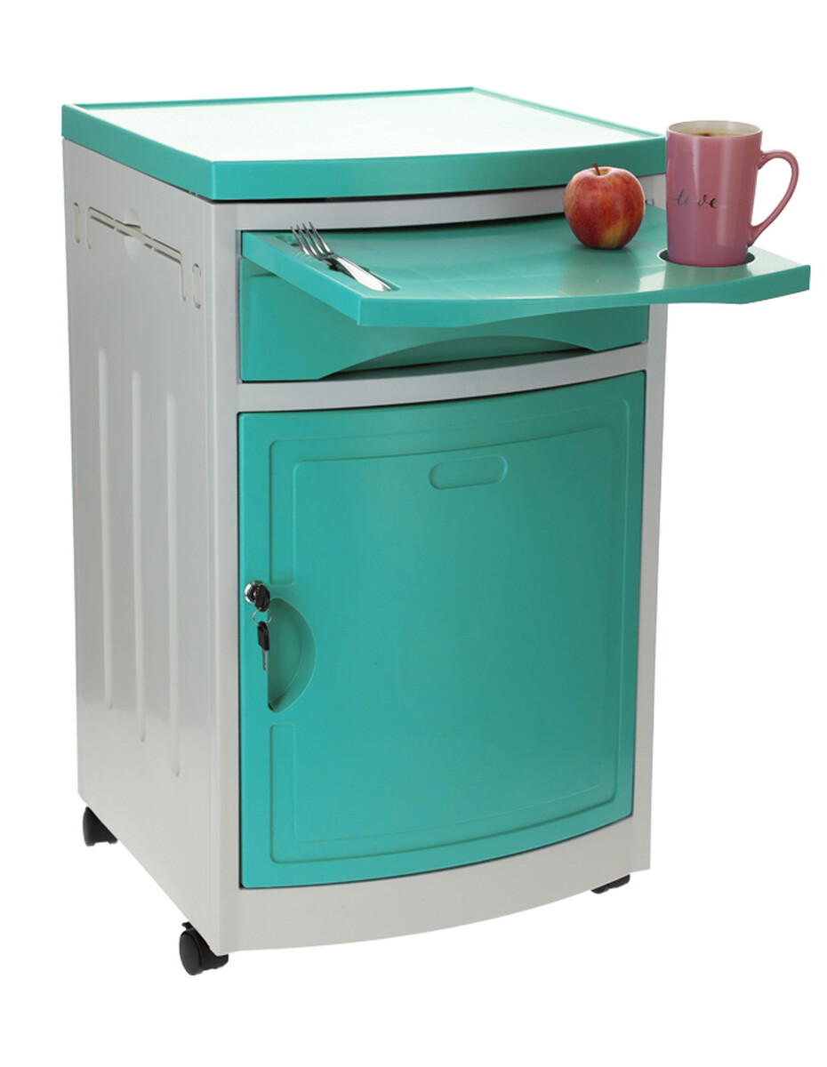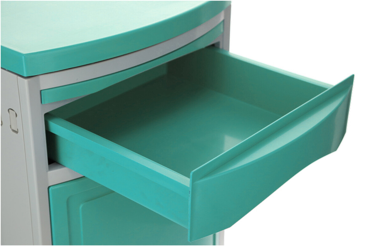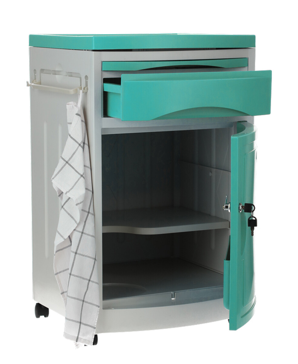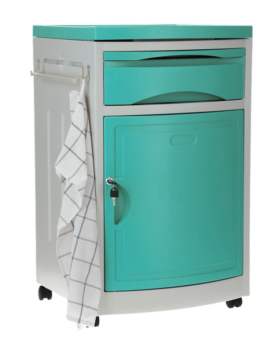 A kórházi éjjeliszekrény állítható ágyakhoz bőséges tárolóhelyet kínál. Az alap szekrényen és fiókon kívül kihúzható étkezőfelülettel és praktikus oldalsó akasztókkal is fel van szerelve.