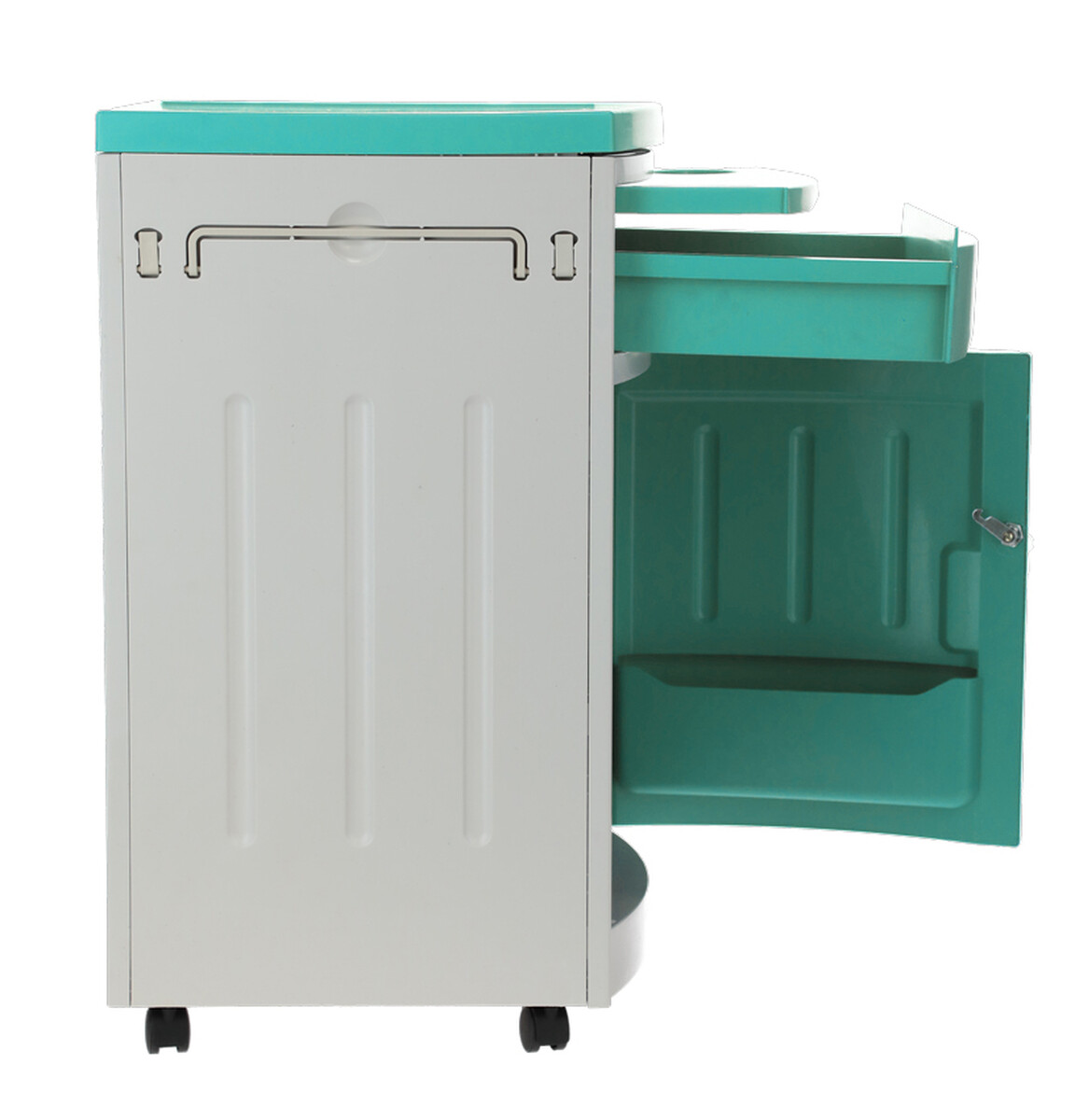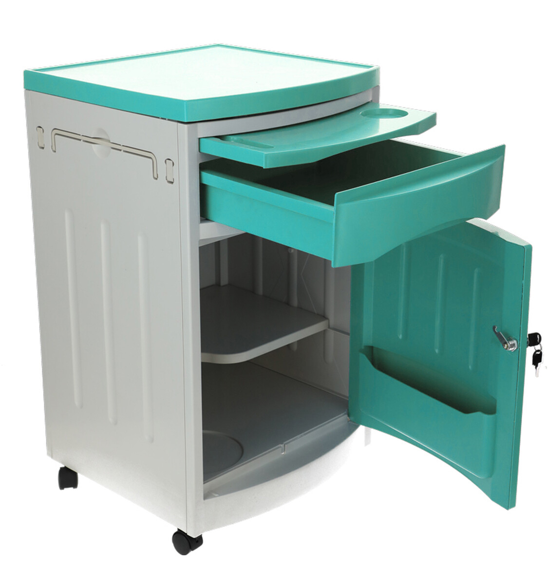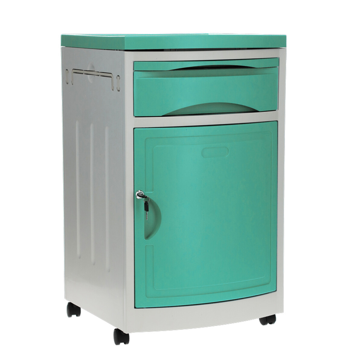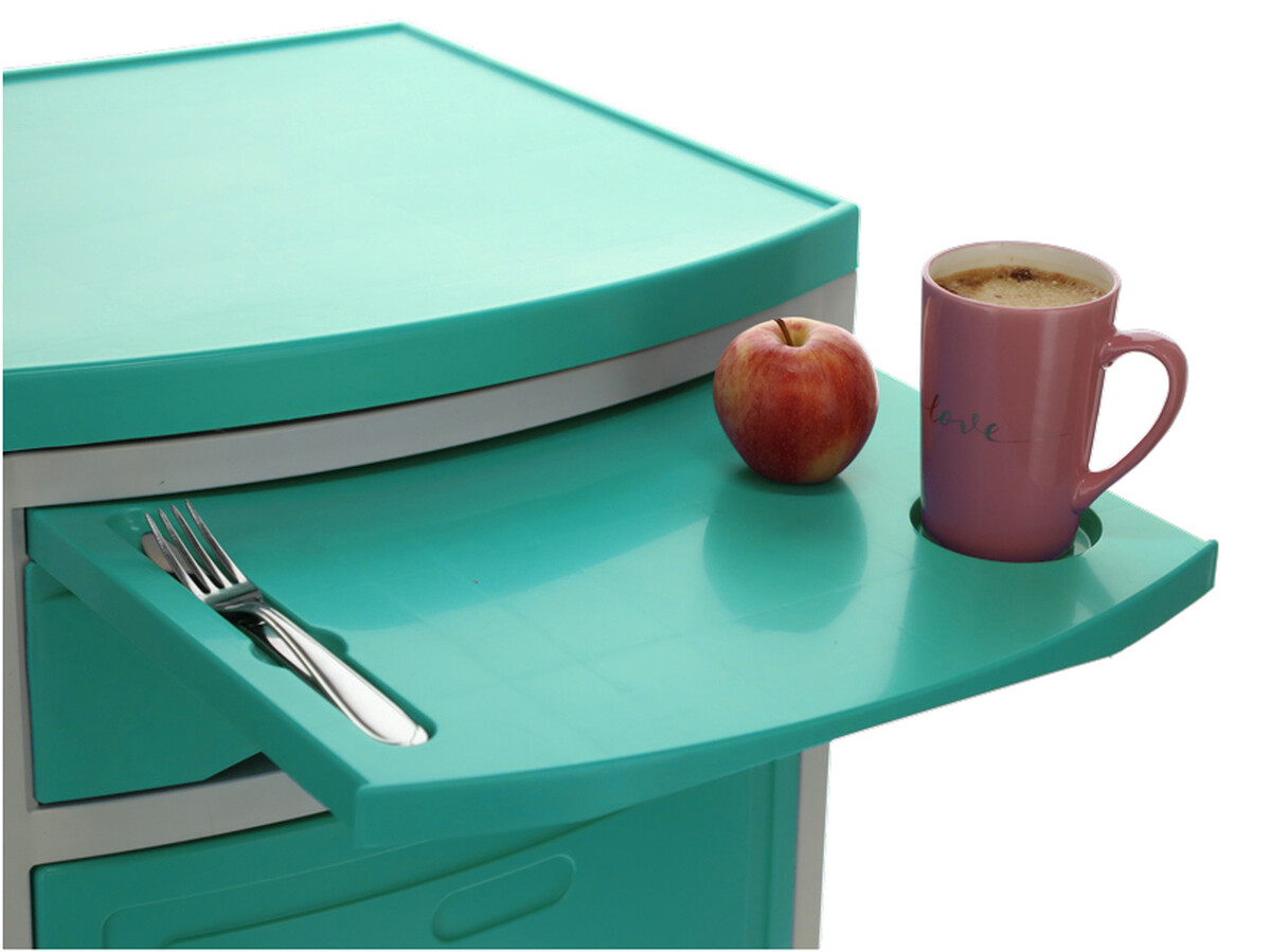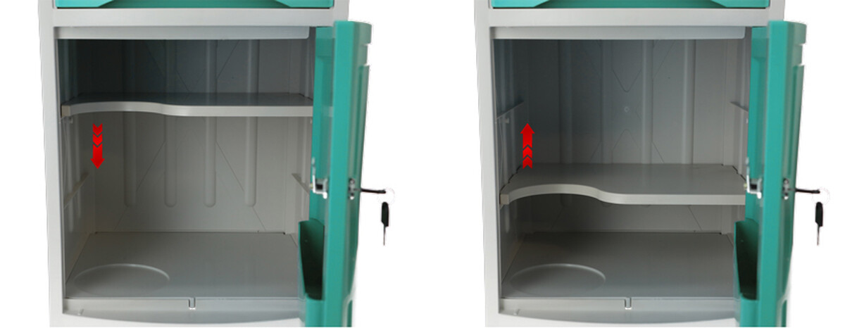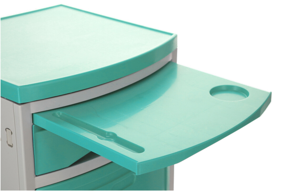 A kórházi éjjeliszekrény állítható ágyakhoz bőséges tárolóhelyet kínál. Az alap szekrényen és fiókon kívül kihúzható étkezőfelülettel és praktikus oldalsó akasztókkal is fel van szerelve.
