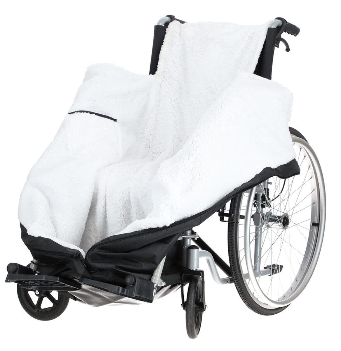 A kerekesszékhez készült bélelt hálózsák, puha és meleg béléssel, amely hatékony védelmet nyújt a hideg, a szél és az eső ellen.